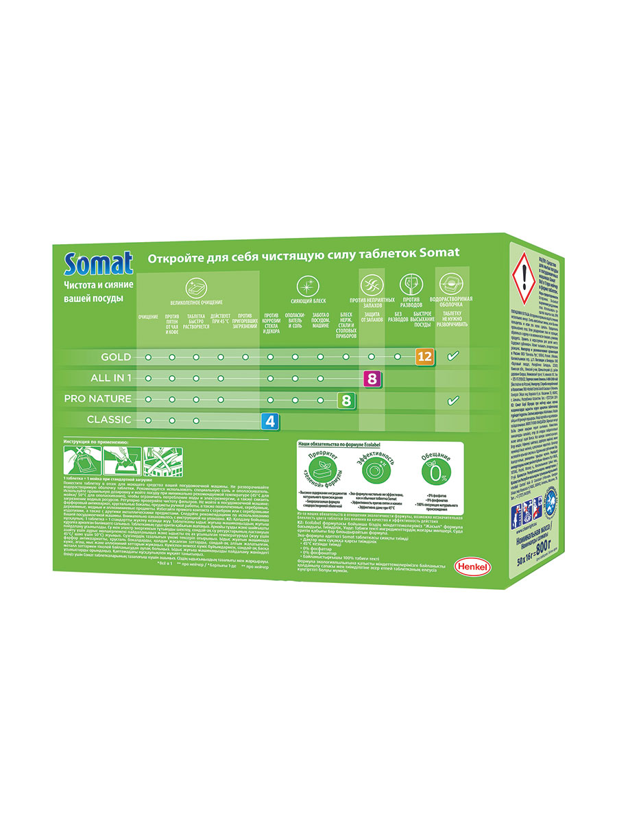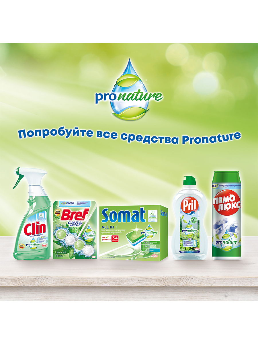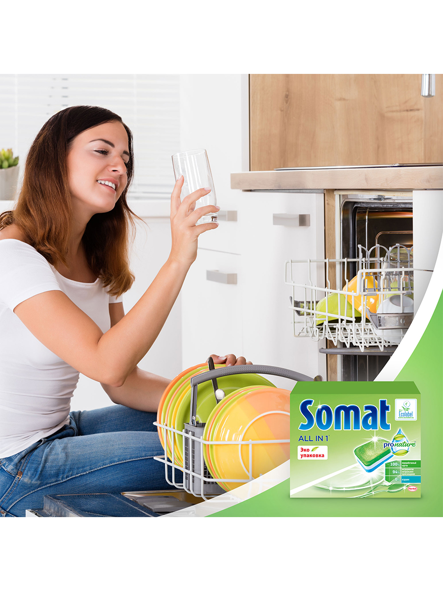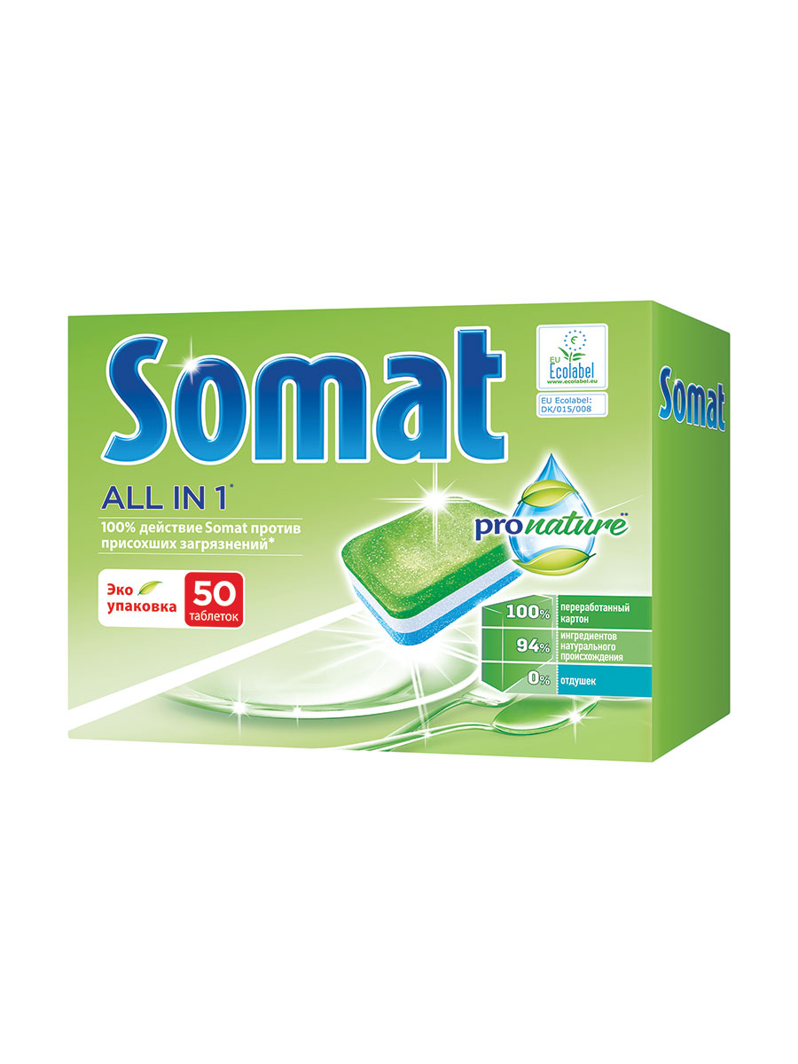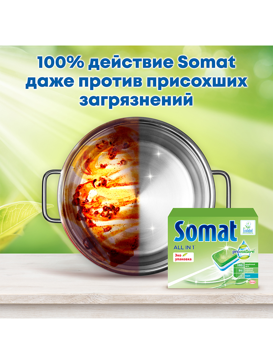 Таблетки для посудомоечной машины Сомат All in 1 Pronature благодаря натуральным ингредиентам гарантируют великолепный результат даже против сложных загрязнений. Средство состоит из 94 % ингредиентов натурального происхождения и не содержит отдушек, агрессивных ПАВ и фосфатов, экологичность подтверждена европейским сертификатом Ecolabel. Каждая таблетка Сомат находится в водорастворимой и биоразлагаемой оболочке.