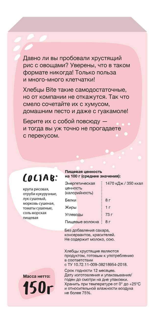 Рисовые хлебцы Bite с морковью и томатом — полезная альтернатива хлебу без глютена, сахара и дрожжей. Они сытные, вкусные и полезные одновременно, ведь в составе только натуральные ингредиенты. Рис содержит клетчатку и растительный протеин, а морковь и томат добавляют пикантности и превращают хрустящие хлебцы в самостоятельный диетический перекус! Но если вы все-таки захотите сочетать их с чем-нибудь, попробуйте жареный тофу, хумус или гуакамоле — обещаем, будет вкусно, полезно и низкокалорийно!