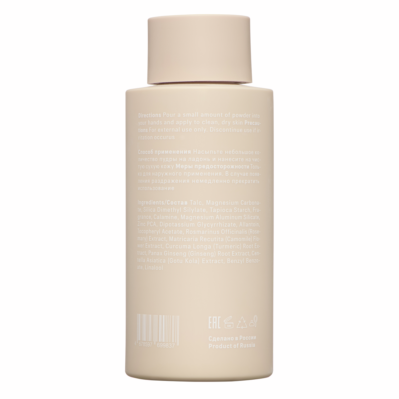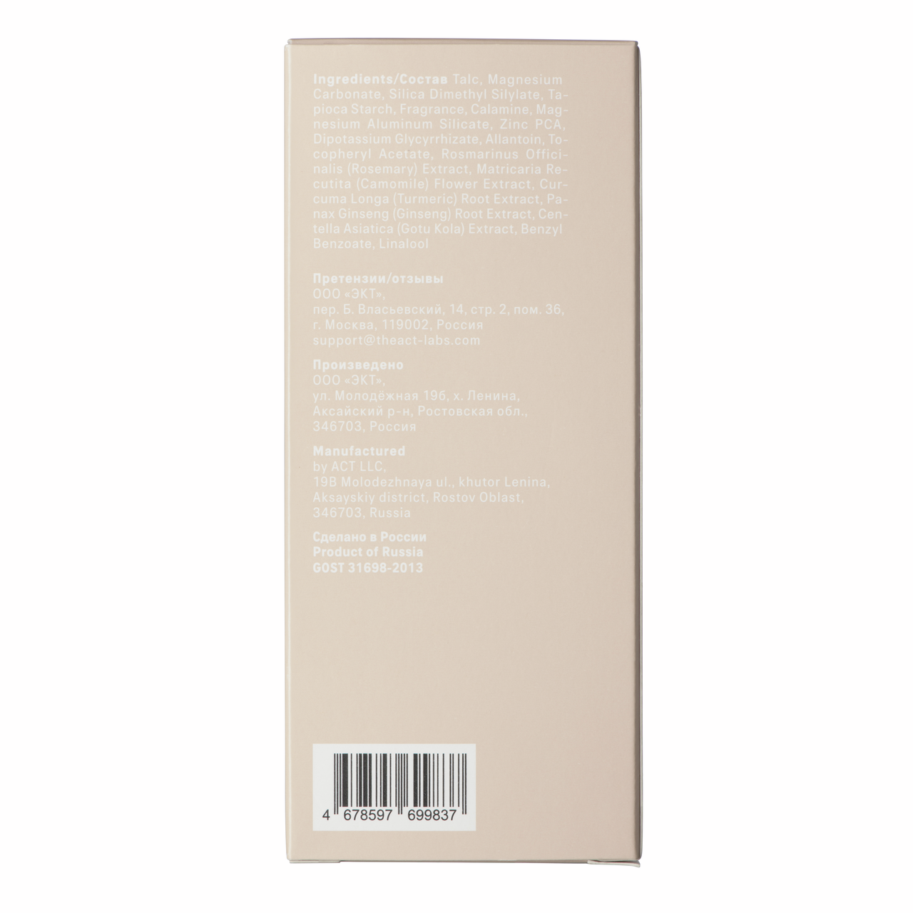 Универсальное средство для заботы о чувствительных зонах. Парфюмированный тальк для тела The Act — средство для красоты кожи на любой случай. Формула позволяет использовать тальк для избавления от неприятного запаха и активного потоотделения. Средство впитывает лишнюю влагу, оставляя лёгкий цветочный аромат с нотами нероли, розы и жасмина. Тальк бережно позаботится о здоровье кожи во время маникюра, депиляции и удалении вросших волос. Продукт поможет избежать раздражения и покраснения после процедур и придаст коже деликатное натуральное сияние. Активные компоненты поддерживают естественную красоту и здоровье кожи. Витамин Е впитывает излишки влаги, защищает от раздражения и пота, придаёт лёгкое сияние и обладает дезодорирующим эффектом. Каламин охлаждает и успокаивает, снимает ощущение дискомфорта. Цинк и аллантоин уменьшают салоотделение и сдерживают рост бактерий, которые влияют на возникновение угрей и прыщей. Комплекс натуральных экстрактов бережно заботится о коже. Экстракты женьшеня и центеллы стимулируют выработку коллагена, разглаживают мелкие морщины, повышают тонус кожи. Экстракты куркумы и ромашки выравнивают тон, успокаивают кожу, устраняют сухость, шелушения и воспаление. Экстракт розмарина сужает поры и матирует кожу, устраняя жирный блеск, а также препятствует появлению воспалений, тонизирует кожу, придавая ей упругость и эластичность. Используйте средство дома или берите с собой, его удобно применять, а флакон не займёт много места в сумочке. У талька рассыпчатая структура, напоминающая присыпку. Нанесите небольшое количество пудры на ладонь, затем распределите на чистую сухую кожу. Тальк впитает лишнюю влагу, успокоит кожу и избавит от дискомфорта. Рекомендован к применению с 14 лет.
