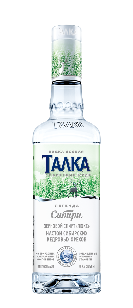 Новинка от уже полюбившегося бренда Талка, представляющего продукцию Сибирского ликероводочного завода. При создании водки использовались исключительно природные компоненты. В ее основе — зерновой спирт класса Люкс. А отличительной чертой водки Талка является то, что она изготавливается из талой ледниковой воды, символизирующей рожденную самой сибирской природой чистоту. Для получения нового вкуса в водку добавили настой кедровых орехов. Такой ингредиент был выбран неслучайно — ведь именно сибирский кедр считается главным деревом таежной Сибири. А кедровые орехи издавна ценятся за свои целебные свойства и богатый макро- и микроэлементами, белками и углеводами состав