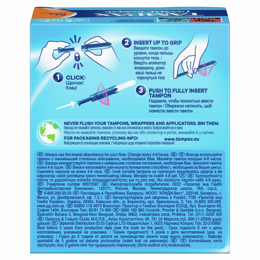 Tampax Pearl Compak- наши лучшие тампоны, сочетающие комфорт, защиту и незаметность. Они не содержат ароматизаторов. Тампоны Tampax Pearl Compak имеют компактный гладкий пластмассовый аппликатор и закругленный кончик для комфортного введения. Благодаря нескользящему рельефу аппликатор удобно держать и вводить. Тампоны Tampax Pearl Compak оснащены технологией MotionFit, поэтому они мягко расширяются, принимая уникальную форму вашего тела. А особое плетение LeakGuard помогает предотвратить протекания. Tampax Pearl Compak имеют яркую индивидуальную упаковку с технологией легкого и бесшумного открывания, поэтому их можно носить в сумочке и использовать в любой ситуации. Tampax Pearl Compak Regular- наши лучшие тампоны для умеренных выделений. Тампоны Tampax Pearl Compak прошли гинекологические испытания. Они также прошли независимую проверку на содержание вредных веществ по стандарту Oeko-Tex.