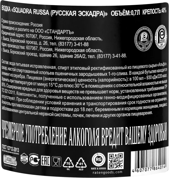 Русская эскадра - премиум водка на основе спирта Альфа. Очень мягкая, тонкий вкус и аромат. Благодаря своему фирменному и монументальному стилю бутылки украсит любой праздничный стол. Представлены различные варианты с серебряными сувенирами в бутылке: корабль, десант, подводная мина, самолет, танк, дельфин и монета. Также Русская эскадра предлагается в различных подарочных упаковках, что станет отличным знаком внимания сильному мужчине.
