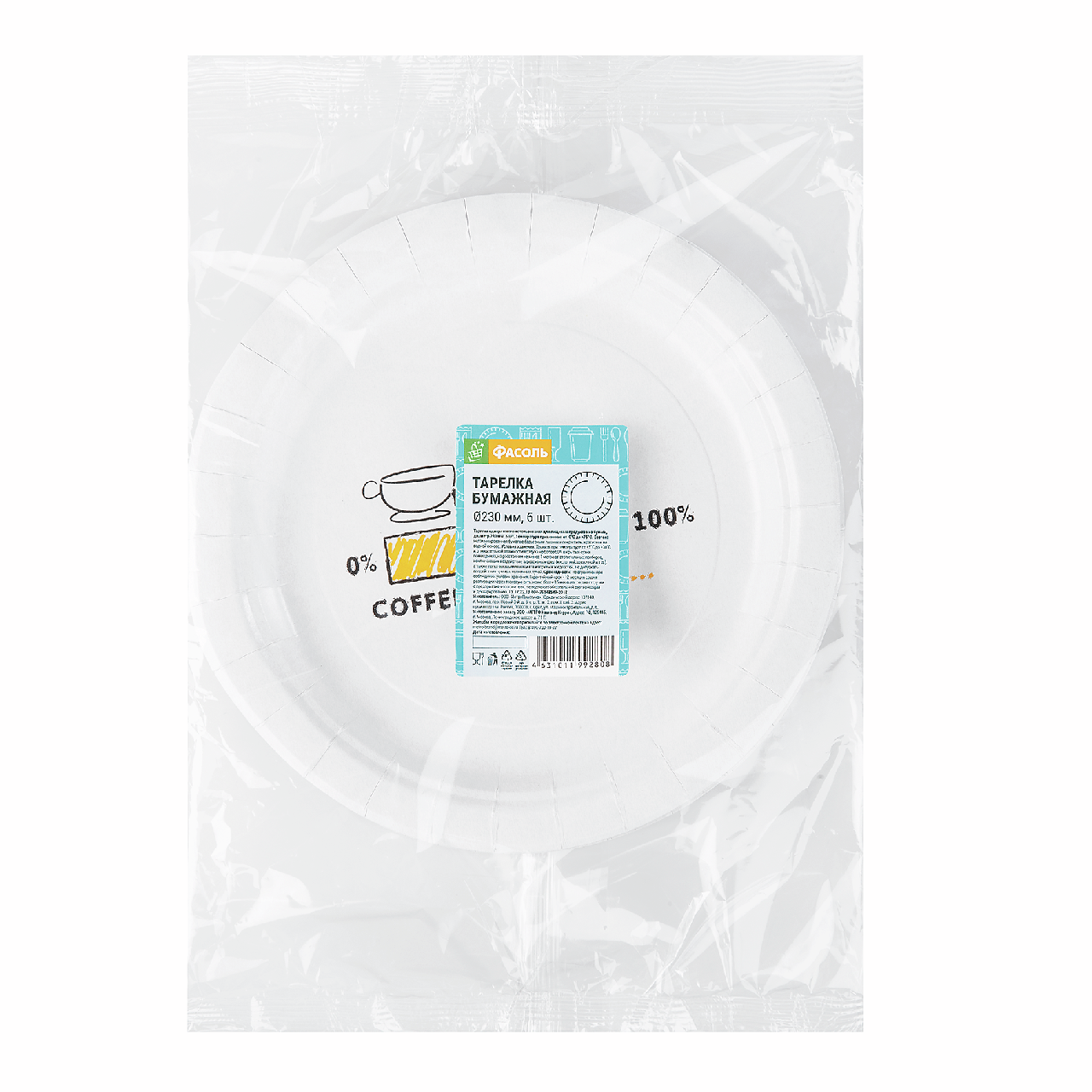 Тарелка одноразовая Фасоль бумажная белая с рисунком 23см, 6шт