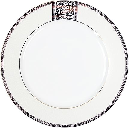 Тарелка, безупречная в повседневном использовании. Современный дизайн удовлетворит самые высокие предпочтения, позволит осуществить сервировку как праздничного стола, обычного семейного обеда, так и делового ужина. Тарелка обеденная "Dynasty" - это фарфоровая тарелка с геометрическим золотистым рисунком по кромке тарелки. Отлично подойдет для подачи горячих и холодных блюд. Фарфор обладает рядом преимуществ. Он более прочный по термическим и механическим свойствам, таким как сколы и царапины, дольше удерживает тепло.