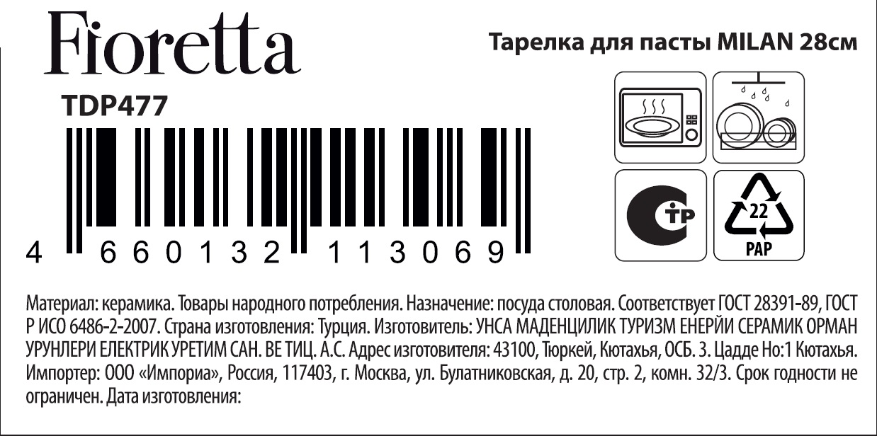 Тарелка Fioretta Milan для пасты, 28 см — это лаконичный и в то же время стильный предмет посуды, который можно использовать для повседневной или праздничной сервировки. Она отличается традиционной формой, поэтому будет выигрышно смотреться как в классическом, так и в современном интерьере. Оптимальный размер тарелки подходит для подачи пасты. Изделие выполнено из материала, который отличается привлекательным внешним видом, высокой прочностью. Поэтому спустя несколько лет посуда будет выглядеть как новая, не пожелтеет и не потрескается. Она хорошо сохраняет тепло и выдерживает высокие температуры. Тарелка не выделяет вредные вещества при нагреве, поэтому безопасна для здоровья человека и может использоваться даже детьми. Ее можно очищать вручную и без опасения мыть в посудомоечной машине. В ней также допустимо разогревать блюда в микроволновой печи. Тарелка для пасты из коллекции Milan составит удачный тандем с другой посудой представленного бренда Fioretta.