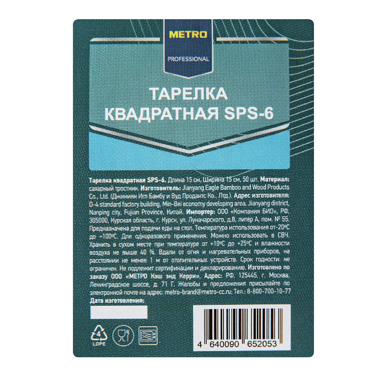 METRO PROFESSIONAL Тарелка одноразовая квадратная из сахарного тростника белая 15 x 15см, 50шт