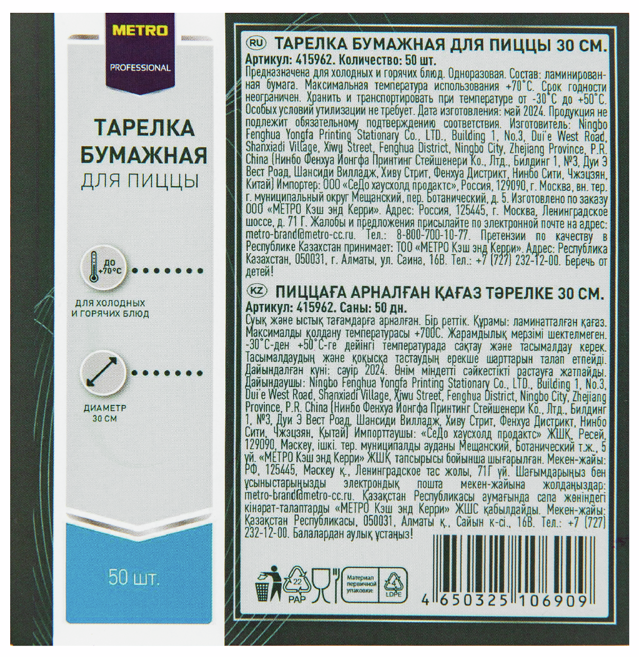 METRO PROFESSIONAL Тарелка для пиццы одноразовая бумажная разноцветная 30см, 50шт