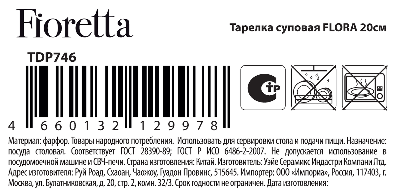 Тарелка суповая Flora 20см. Бренд Fioretta известен своими коллекциями керамической, стеклянной и фарфоровой посуды. Изделия, выпускаемые под данной маркой, отличаются разнообразием и оригинальным исполнением и дизайном. Наборы Fioretta достойно украсят любой праздничный стол, а также станут приятным подарком на юбилей или свадьбу. Идеальна для подачи первых блюд, бульонов и многого другого.