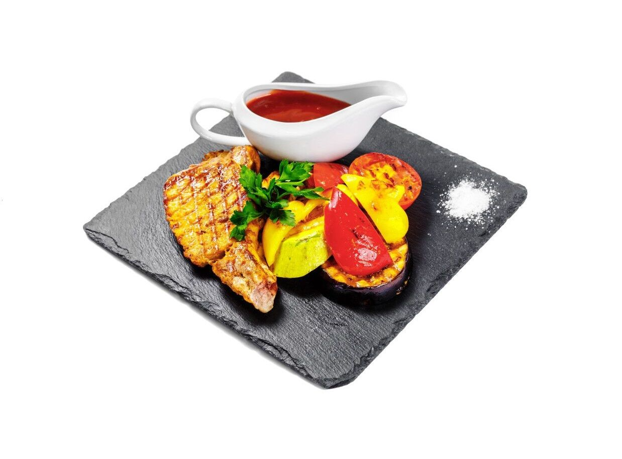 Tarrington House Тарелка из сланца, 25 х 25 см – это стильная и оригинальная посуда. Ее активно используют на предприятиях общественного питания, особенно в кафе быстрого питания и точках продажи фастфуда. На плоской каменной тарелке подают бургеры, горячие и холодные закуски. Ее можно использовать в качестве подставки для бутербродов и сэндвичей. Она отлично подходит для применения в домашних условиях. Сланцевая тарелка при минималистическом дизайне смотрится эффектно. Квадратный черный плоский камень как бы отсылает к доисторическим временам. Он хорошо поддерживает тепло: помещенные на него горячие продукты остывают медленней, чем на керамической тарелке. Тарелка из сланца при правильной эксплуатации прослужит долгие годы, не теряя при этом внешней привлекательности. Достаточно соблюдать рекомендации производителя по уходу за такой посудой. Изготовлена она из безопасного для человека материала – природного сланца. Он не меняет вкусовые качества продуктов при контакте с ними, не впитывает запахи и не выделяет опасных или токсичных веществ. Тарелка подходит для подачи как холодных, так и горячих блюд. Загрязнения легко удаляются с поверхности при мытье под проточной водой. По мере необходимости можно использовать различные моющие средства.
