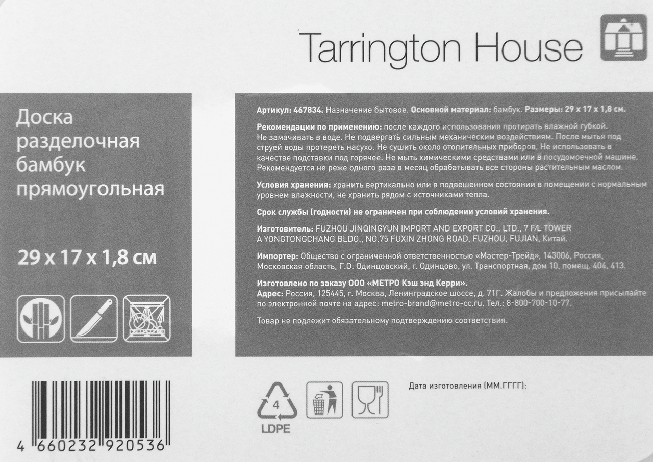Tarrington House Доска разделочная бамбук со скошенными краями, 29 x 17 x 1.8 см – удобный и незаменимый аксессуар. Его можно использовать как в домашних условиях, так и на любых предприятиях общественного питания. Доска рассчитана на длительную эксплуатацию. Она прочная и надежная, не скользит во время работы по столу и другим поверхностям. Она компактная, занимает минимум места в шкафах. Ее можно подвесить за ручку, расположенную на одной из кромок. Разделочная доска изготовлена из прочного и экологически чистого материала – 100% бамбука. Он абсолютно безопасен для человека. При контакте с продуктами питания не меняет их вкусовые качества и не впитывает в себя посторонние запахи. Такой материал не подвержен негативному влиянию внешних факторов. Доска удобна в эксплуатации. На ней имеются специальные бортики, в которые стекает жидкость. При контакте с бамбуковой доской на ноже не появляется зазубрин. Ухаживать за изделием легко. Его можно мыть под горячей и холодной проточной водой с применением различных моющих средств.