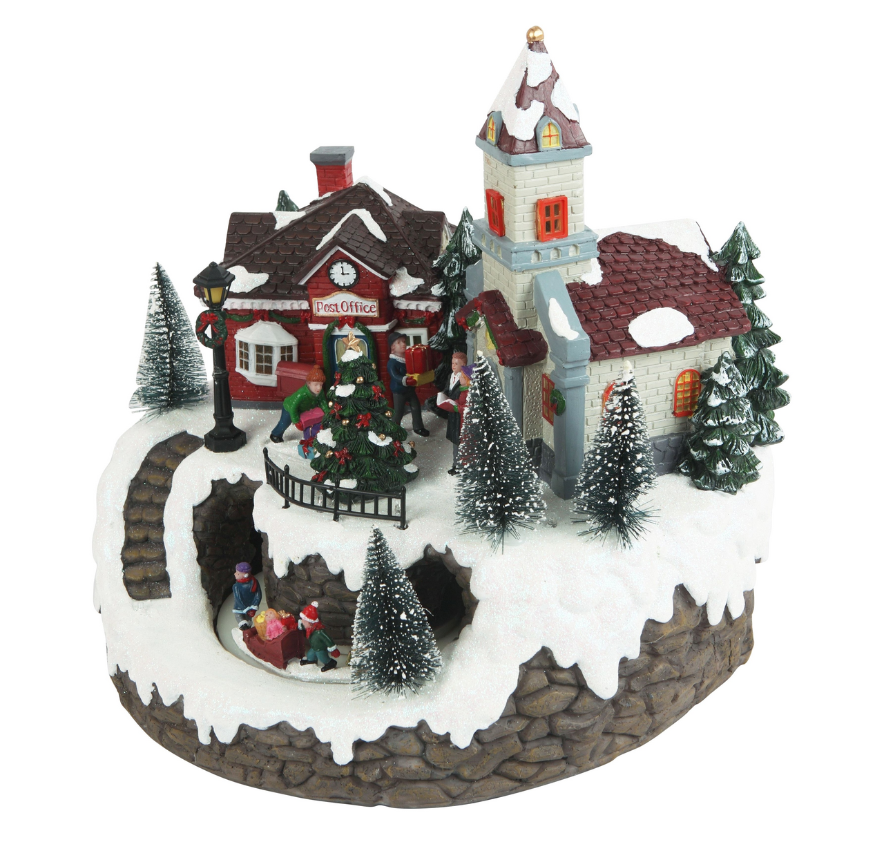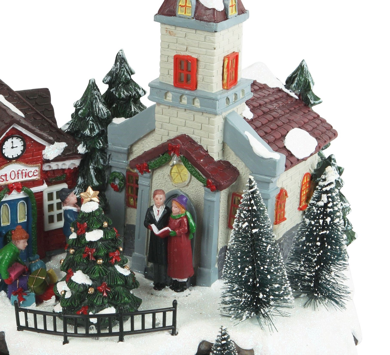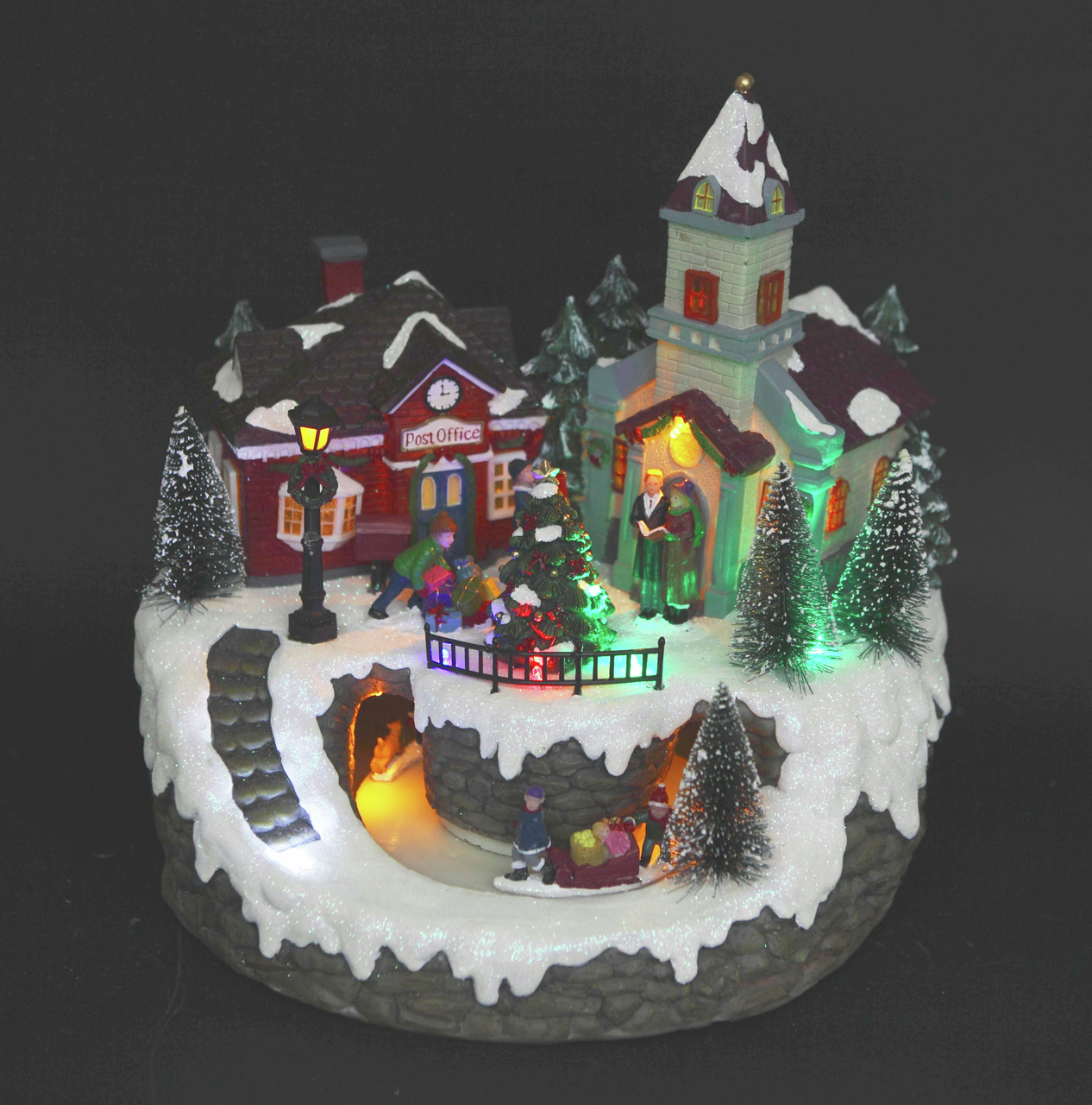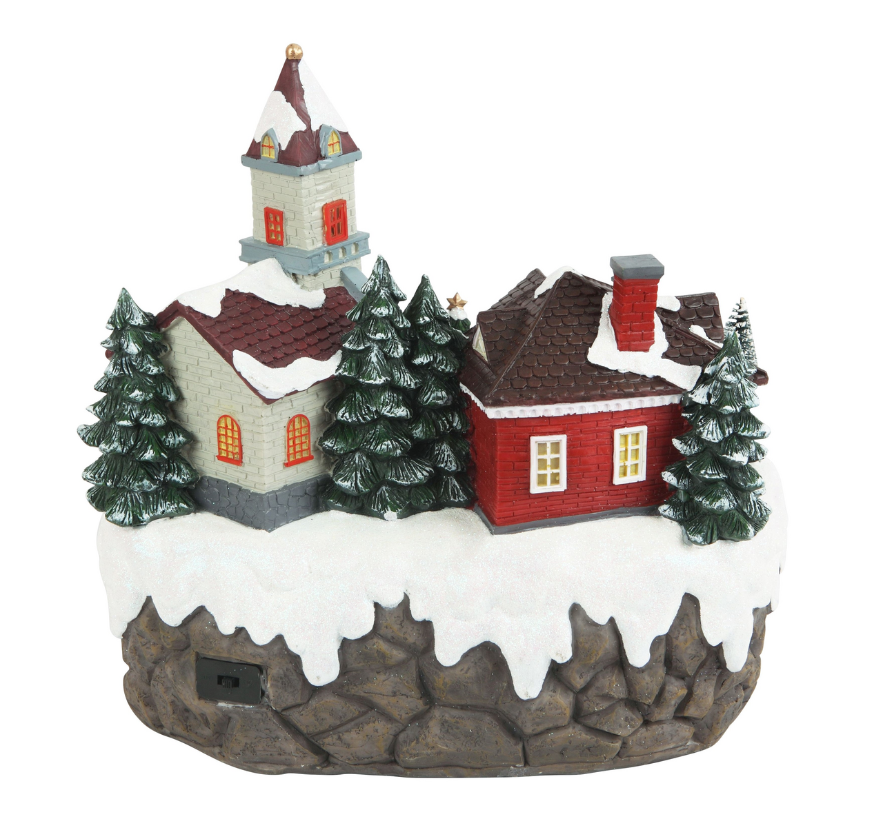 Вращающаяся композиция с подсвеченными домиками и фигурками. Музыкальное сопровождение добавляет волшебства. Фигура предназначена для размещения на столах, комодах, каминных полках и на подоконниках окон. Работает от батареек, в комплект не входят. Степень защиты IP20 (рекомендуется использовать в помещениях)