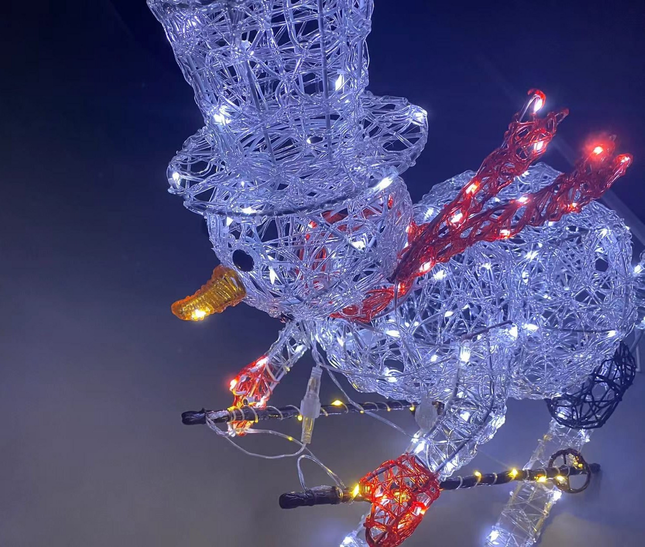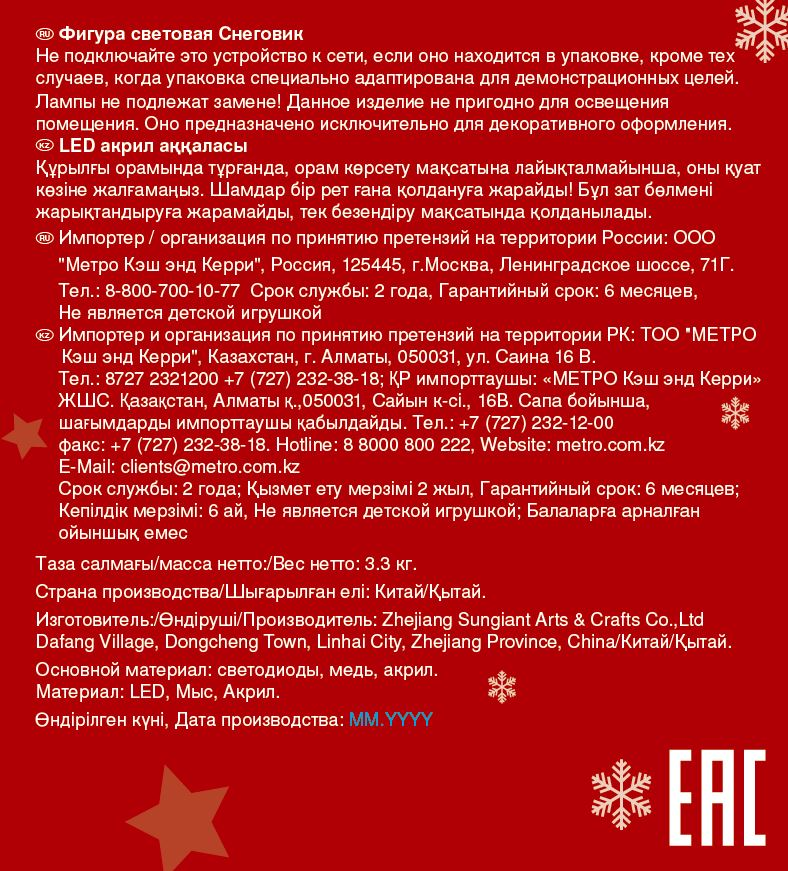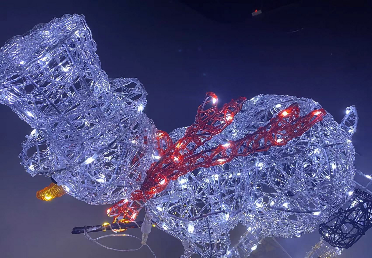 Светящийся снеговик высотой 75 см станет добрым символом зимы в вашем саду или у входа в дом. Фигура украшена 150 ледяными белыми светодиодами, создающими эффект искрящегося снежного покрова и мягкое холодное сияние. Прочная металлическая конструкция с элементами из акрила и меди обеспечивает устойчивость и долговечность, а разборная система упрощает хранение в межсезонье. Защита IP44 гарантирует бесперебойную работу даже в снегопад и дождь. Длинный кабель питания 10 метров и безопасное напряжение 4.5В позволяют установить снеговика в любом удобном месте участка, а энергопотребление всего 3.6 Вт делает эксплуатацию экономичной. Умеренный вес 3.3 кг обеспечивает устойчивость фигуры, а ее дружелюбный образ наполнит ваше пространство светом и радостью долгими зимними вечерами.