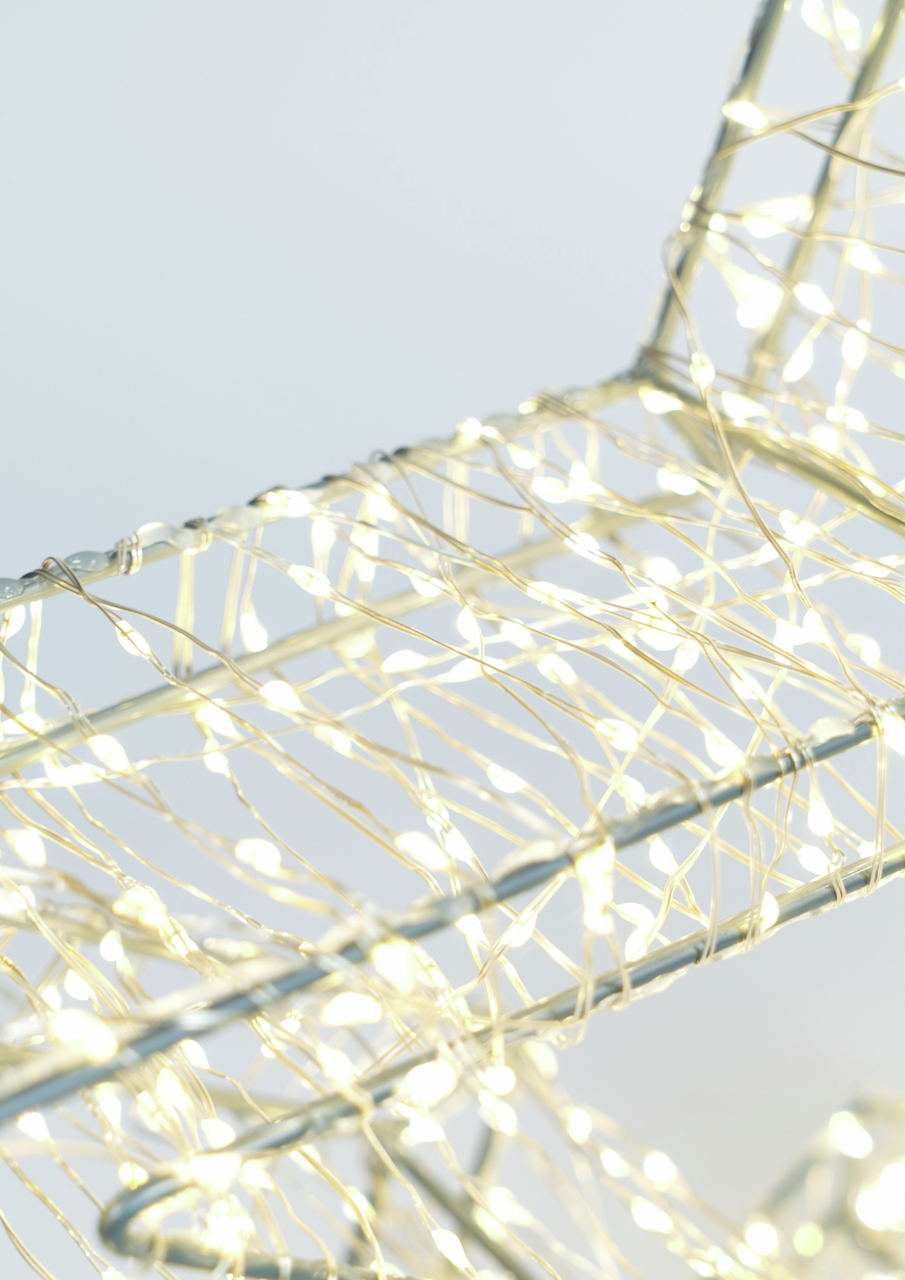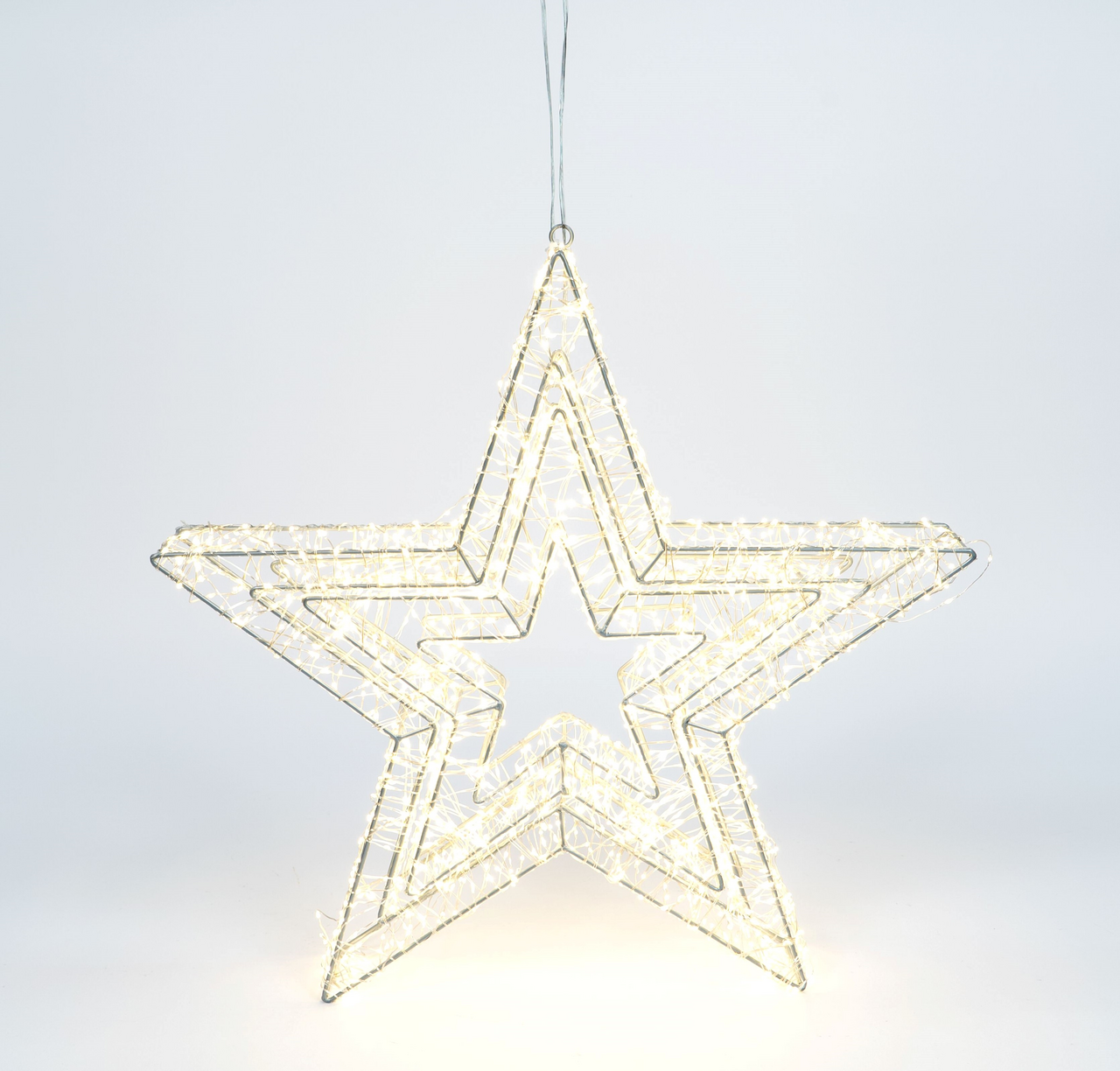 Пара роскошных световых звезд создаст эффектный дуэт в вашем праздничном оформлении. Композиция включает большую звезду диаметром 50 см с 1200 светодиодами и малую звезду диаметром 32 см с 600 светодиодами, вместе образующими 1800 точек теплого белого свечения. Железная конструкция обеспечивает прочность и устойчивость, а частое расположение диодов (каждые 5 см) создает плотное равномерное сияние. Защита IP44 гарантирует бесперебойную работу под открытым небом в любую зимнюю погоду. Длинный кабель питания 5 метров и безопасное напряжение 24В позволяют легко выбрать место для размещения, а разная мощность звезд (12 Вт и 6 Вт) обеспечивает экономичную эксплуатацию. Небольшой общий вес 1.12 кг делает композицию мобильной, позволяя создать яркий акцент на фасаде, в саду или у входной группы. Эти сияющие звезды станут символом праздника, наполняя ваше пространство теплом и волшебством.