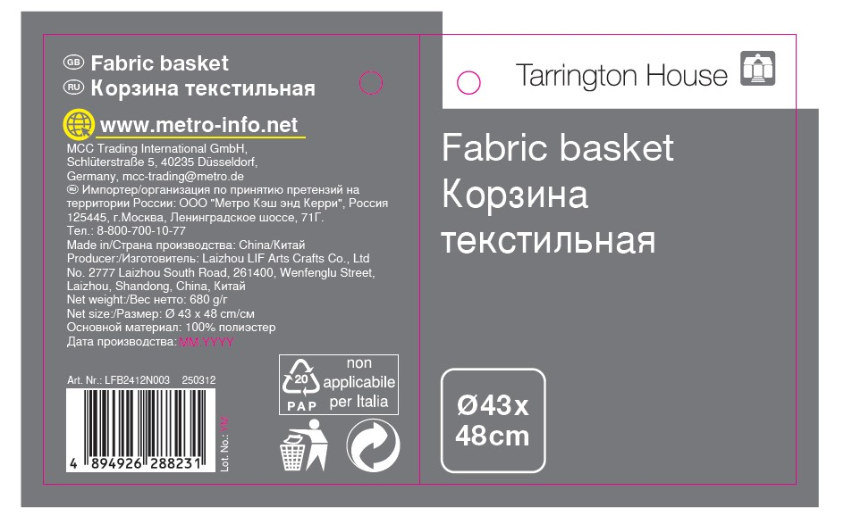 Tarrington House Корзина для белья Laundry New текстильная круглая, 45 x 56см