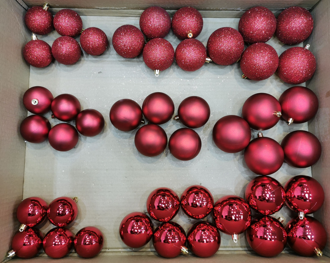 Изысканное решение для безупречного праздничного декора! Каждый набор включает 45 шаров трех размеров (6, 7 и 8 см) в элегантной цветовой гамме: сияющее золото, благородное серебро или классический красный. Особую ценность придает упаковка — прочные пластиковые шары бережно размещены в изящных мешочках из струящейся органзы, что создает эффект дорогих праздничных подарков. Идеальный выбор для тех, кто стремится к гармоничному и стильному оформлению праздника!