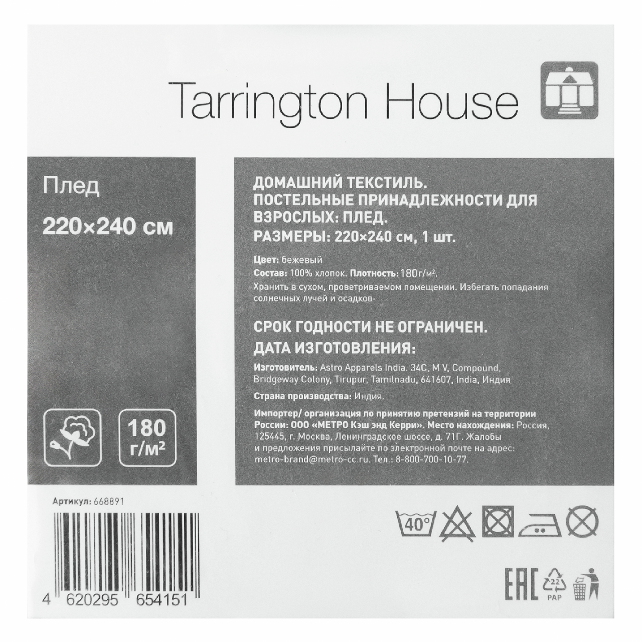 Tarrington House Плед вафельный Bella бежевый, 220 x 240см
