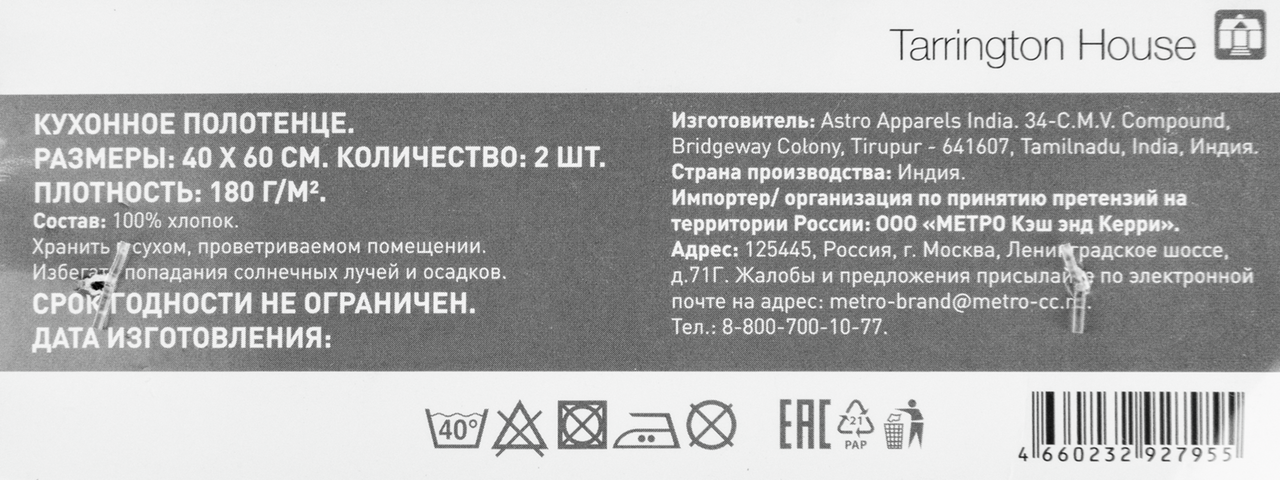 Tarrington House Полотенце кухонное полоска + однотонное белое с синими полосками + синее, плотность 180 г, 2 штуки, 40 x 60 см предлагает уникальное сочетание стиля и практичности. Идеальное дополнение для вашей кухни, этот комплект порадует вас своей функциональностью и элегантным дизайном. Главное преимущество этих полотенец — их вафельная текстура, которая обеспечивает отличную впитываемость и быстрое высыхание. Вы можете быть уверены, что все капли или пятна будут легко удалены с их помощью. Кроме того, они обладают высокой прочностью и стойкостью к износу, способны несколько лет служить вам верой и правдой. Выбирая полотенца Tarrington House, вы можете быть уверены в их качестве. Они изготовлены из высококачественного материала, который гипоаллергенен и долговечен. Они также легки в уходе и могут легко стираться в стиральной машине. Серый цвет и клетчатый-полосатый узор делают эти полотенца стильными и универсальными. Они органично впишутся в любой интерьер вашей кухни, придавая ему особенный шарм и элегантность. Это не только отличный инвестиционный вариант для вашей собственной кухни, но и идеальный ��одарок для близких вам людей.
