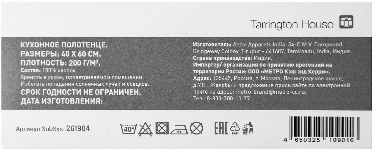 Tarrington House Полотенце кухонное вафельное бежевое с узором 200г, 40 x 60см - изготовленное из хлопка, это полотенце обеспечивает максимальную мягкость и комфорт при использовании. Кроме того, хлопок является натуральным и гипоаллергенным материалом, что делает его безопасным для использования в контакте с пищей. Оно легко впитывает влагу и быстро сохнет после использования, что помогает поддерживать чистоту и гигиену в кухне. Удобная форма и размер полотенца позволяют легко использовать его во время готовки, мытья посуды или уборки. Оно может быть использовано для вытирания рук, посуды, столовых приборов или поверхностей, таких как столы и рабочие поверхности.