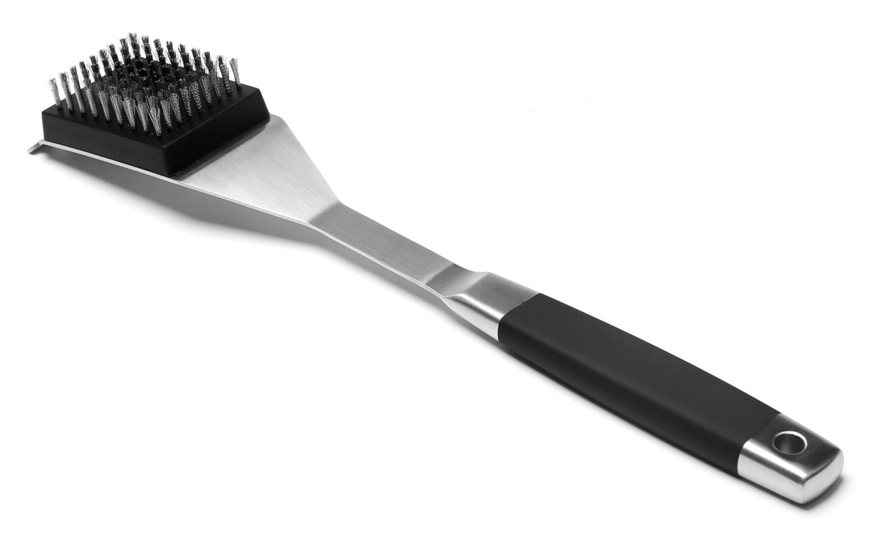 Tarrington House Щетка для гриля из металла пластика предназначена для ухода за металлическими решетками, на которых запекают мясо, птицу и другие блюда. Она помогает с легкостью поддерживать аксессуары для гриля в чистоте, без усилий избавляя их от жира, нагара и прилипших остатков пищи. Для полной гигиены рекомендуется пользоваться щеткой дважды: перед началом приготовления и после окончания жарки блюда. Жесткие щетинки щетки изготовлены из тонкой нержавеющей стали и моментально справляются с самыми стойкими загрязнениями. Убрать сильный нагар поможет предусмотренный с другой стороны изделия металлический скребок. Благодаря эргономичной форме длинная ручка комфортно лежит в ладони, обеспечивая надежный хват. На конце ручки предусмотрена упрощающая хранение аксессуара мягкая кожаная петля для подвешивания. Аксессуар позволяет ухаживать за изделиями из различных материалов: хрома, чугуна, нержавеющей стали. Для очистки щетку рекомендуется мыть вручную в теплой воде с добавлением моющего средства.