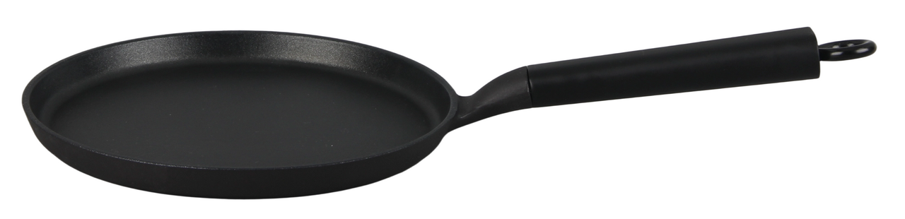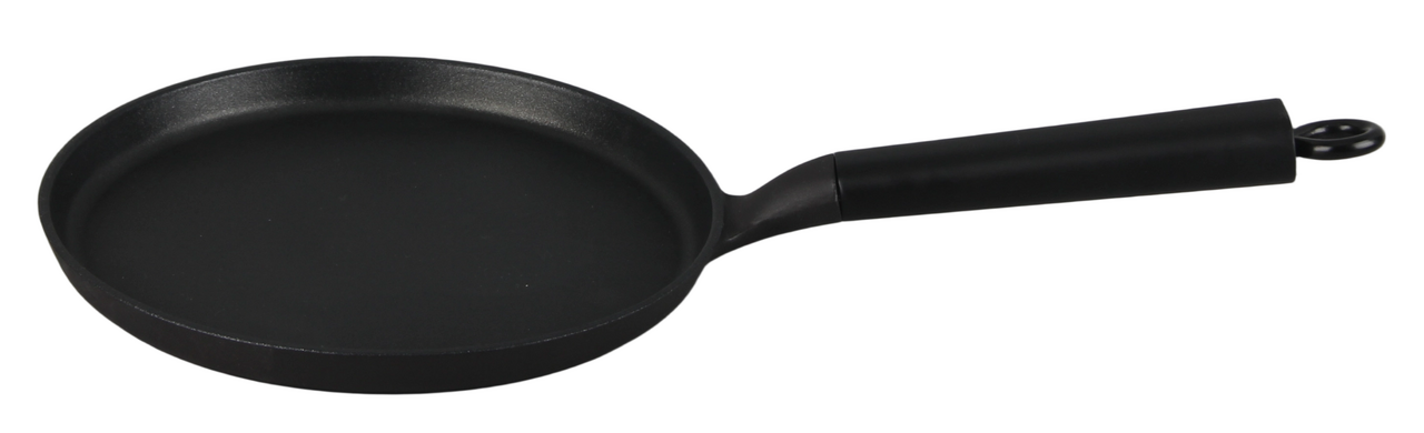 Блинная чугунная сковорода с антипригарным покрытием премиум класса. Готова к использованию, не нужно прокаливать. Не выделяет вредных веществ. Равномерно и быстро прогревается. Для всех видов плит, включая индукционные.