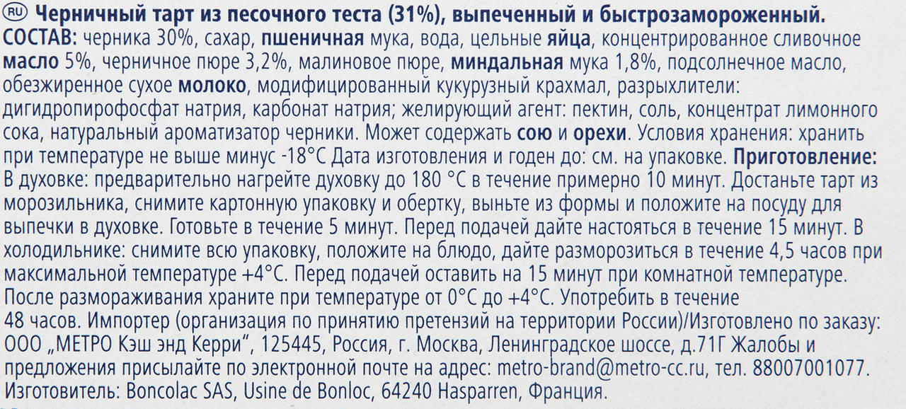 Тарт METRO Chef черника, 900г — открытый пирог с ягодной начинкой, классическое блюдо французской кухни. Приготовлен он из специального песочного теста и дополнен спелыми ягодами малины. Это вкусный и сытный десерт, который понравится и детям, и взрослым. Тарт обладает хрустящей основой с небольшими бортиками и отлично сочетается с какао, латте, капучино и другими кофейными напитками, а также черным или зеленым чаем, компотом и узваром. Замороженный пирог быстро готовится, а подать его можно как к праздничному, так и повседневному столу. Выпуская продукцию под собственными торговыми марками METRO, мы стремимся максимально удовлетворить потребности наших клиентов. Наша цель – понять, какой ассортимент для них актуален и предложить его по привлекательной цене. Мы также внимательно изучаем тенденции рынка, чтобы быть в курсе последних трендов и своевременно предлагать решения под собственными торговыми марками в соответствии с ними. Бренд METRO Chef хорошо известен во всем мире. Продукция этой торговой марки отличается отменным вкусом и превосходным качеством.