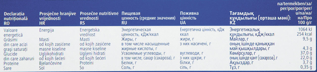 Мука пшеничная в/с, смородина черная, малина, сахар, продукт яичный (меланж), вода, жир растительный, сироп глюкозный, масло подсолнечное, какао-порошок, эмульгаторы (эфиры глицерина, диацетилвинной и жирных кислот, моно- и диглицериды жирных кислот, сорбитовый сироп, лецитин), желатин, белок молочный, молоко сухое обезжиренное и цельное, патока, агенты желирующие (пектин, каррагинан), глюкоза, разрыхлитель (гидрокарбонат натрия), соль, сыворотка молочная сухая, регулятор кислотности (кислота лимонная), консервант (сорбат калия), пшеничные пищевые волокна, крахмал картофельный, красители (кармин, серебро, уголь растительный), ароматизаторы.
