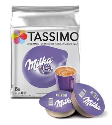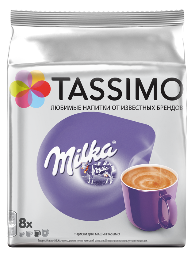 Tassimo Milka - горячий напиток с какао, молоком и сахаром. Обновленная рецептура Tassimo Milka обеспечивает улучшенные вкусовые качества продукта и сокращение времени приготовления напитка. Содержит только натуральные компоненты.