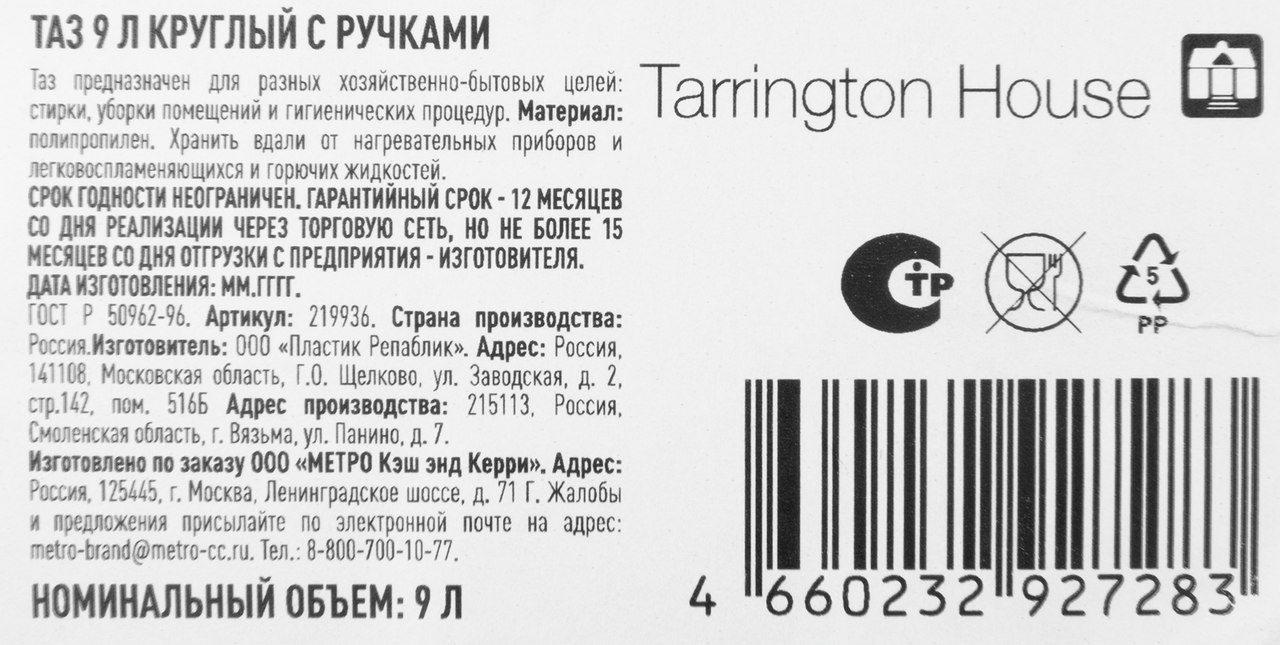 Таз круглый с ручкой Tarrington House, 9 л — это хозяйственная принадлежность, незаменимый помощник в повседневной жизни, который облегчает быт и гармонично вписывается в любой стиль интерьера. Практичная модель помогает справляться с разными задачами: поливом растений, сбором урожая, уборкой в доме, на приусадебном участке. Ее можно использовать во время моющих работ, для мытья посуды или овощей, сбора мусора или других бытовых задач. Изделие имеет круглую форму и объем 9 л, что значительно упрощает стирку, гигиенические процедуры и пр. Таз оснащается двумя удобными ручками для переноски. Прочный пластик устойчив к механическим повреждениям, влаге и солнечным лучам. Любые загрязнения на поверхности легко устраняются с помощью влажной губки или салфетки. Со временем модель не теряет первоначальные характеристики, сохраняет форму и цвет. Благодаря компактным размерам таз легко помещается под раковиной или в шкафу для экономии места в доме.