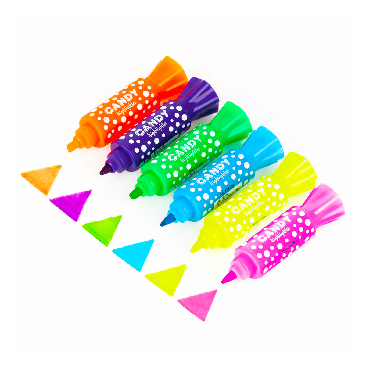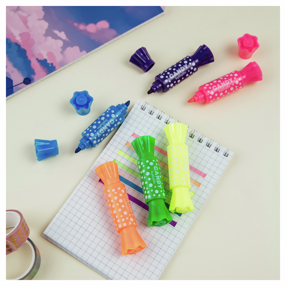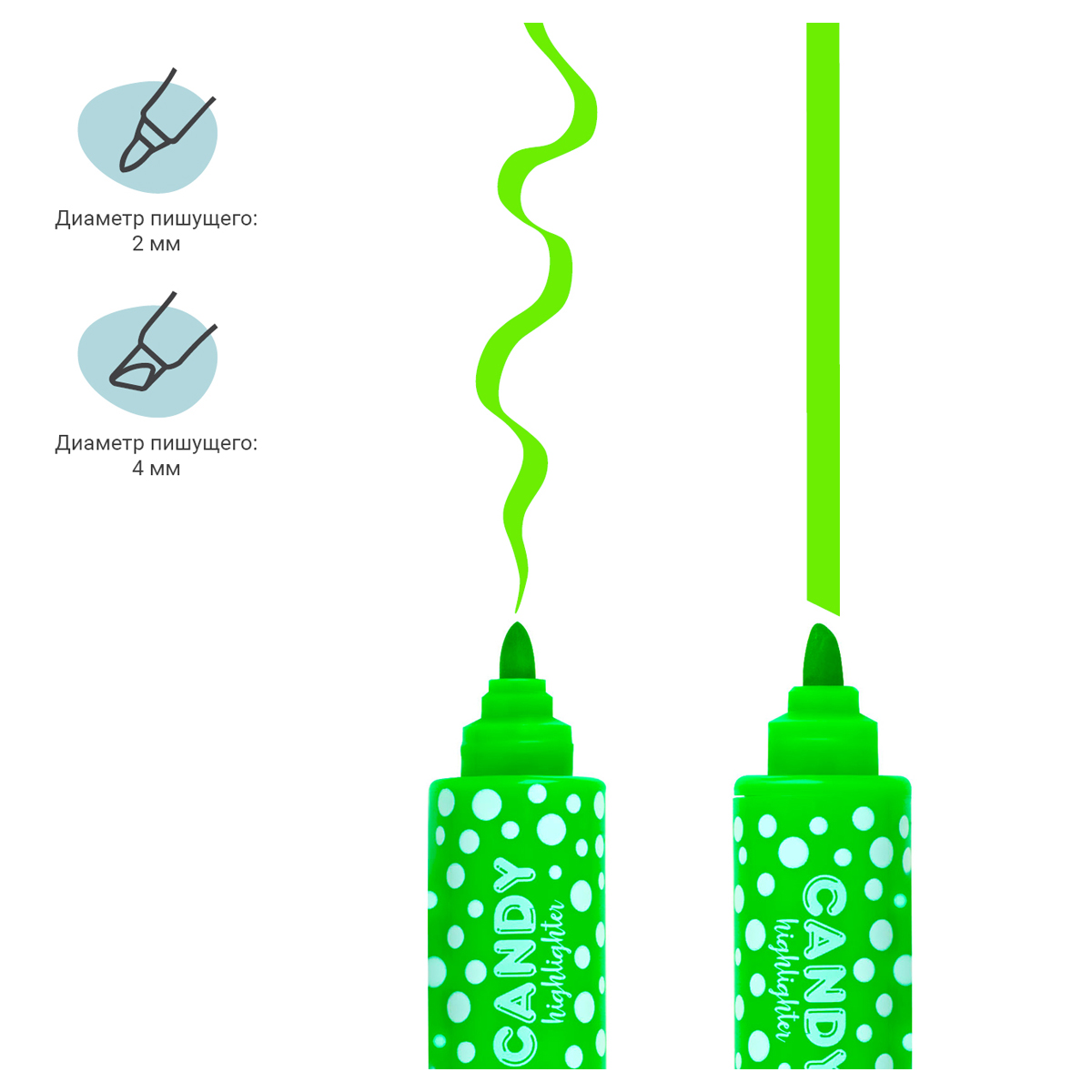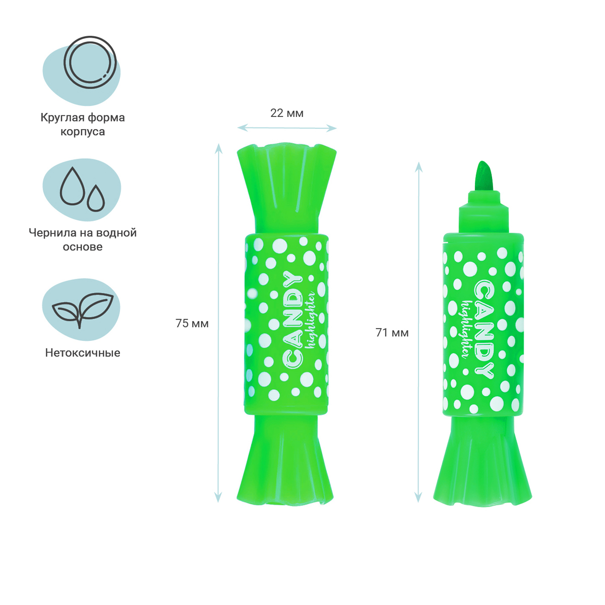Текстовыделитель Meshu Candy двусторонний отлично подойдёт тем, кто хочет поднять себе настроение на учёбе или работе. Представлено шесть неоновых текстовыделителей в форме сладостей: жёлтый, розовый, зелёный, голубой, оранжевый, фиолетовый. Длина линии письма может достигать 200 метров. Двусторонний текстовыделитель Meshu Candy на водной основе представлен со скошенным пишущим узлом с толщиной линии 4 мм и пулевидным – 2 мм. Компактный размер 17,5 мм идеально подходит для пенала. Цвет колпачка и корпуса соответствует цвету чернил.