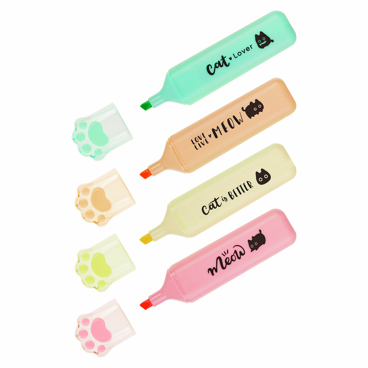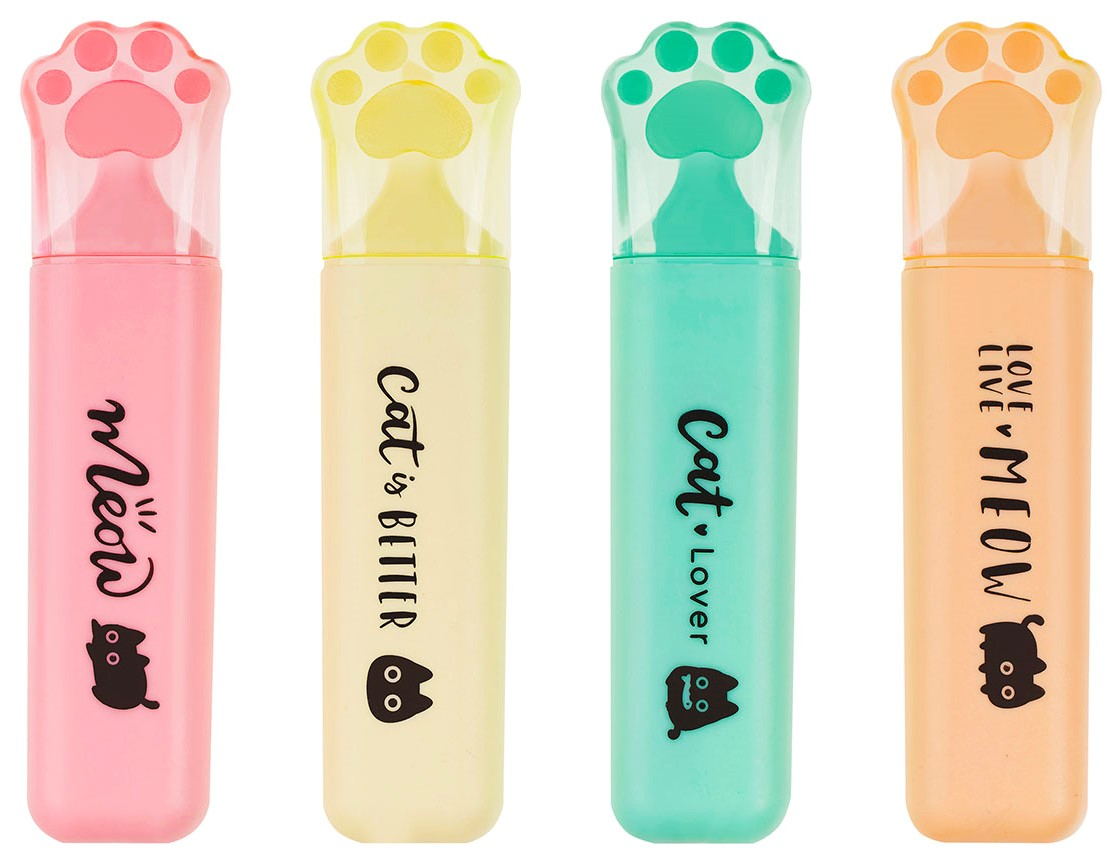 Набор текстовыделителей Meshu Live, Life, Meow, с пастельными чернилами на водной основе - универсальные канцелярские принадлежности в оригинальном дизайне. Скошенный наконечник позволяет регулировать толщину линии письма от 1 до 5мм, за счёт чего изделия подходят для выделения большинства шрифтов. Благодаря классической форме корпуса текстовыделители удобно держать.Текстовыделители с колпачком в форме милой лапки и забавными надписями созданы поднимать настроение на работе или учёбе. Цвет лапки на колпачке соответствует цвету чернил. Текстовыделители упакованы в ПВХ-бокс с европодвесом по 4шт.- Толщина линий: 1-5мм; - Цвет чернил: ассорти (4 пастельных оттенка); - Упаковка: ПВХ-бокс с европодвесом; - Количество штук в упаковке: 4.