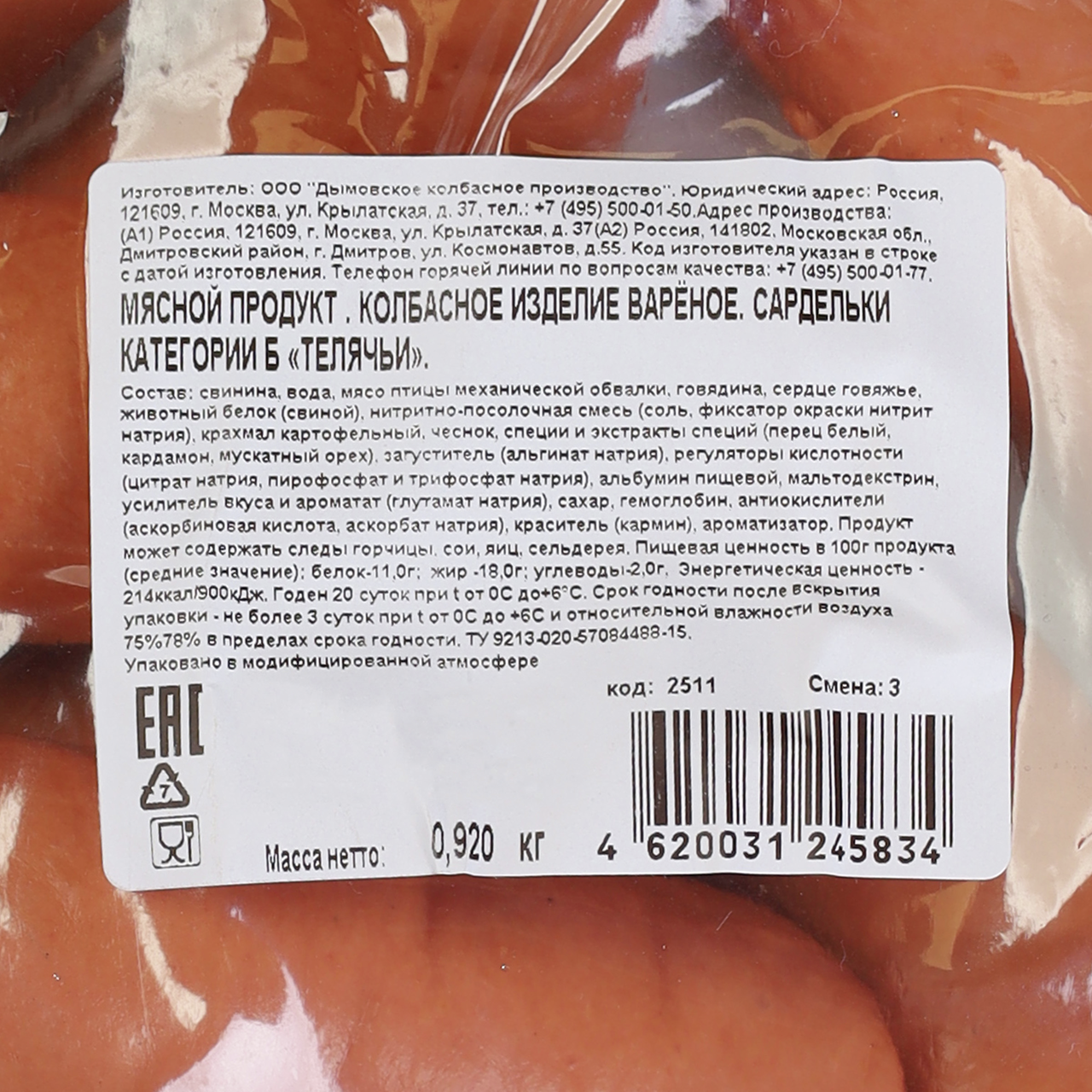 Сардельки Дымов Телячьи, 920г представляют собой питательный продукт, который подойдет для быстрого приготовления обеда или ужина. Он подается с гарнирами, соусами, хлебом. Сардельки отличаются характерным мясным вкусом. Их можно использовать как начинку, в бутербродах и сэндвичах. Продукт стоит взять с собой на пикник или дачу, чтобы приготовить его на шампурах или решетке. Он помещен в натуральную оболочку, отличается сбалансированным содержанием жиров, белков и углеводов, что положительно сказывается на всем организме. Сардельки можно включить в повседневный рацион.