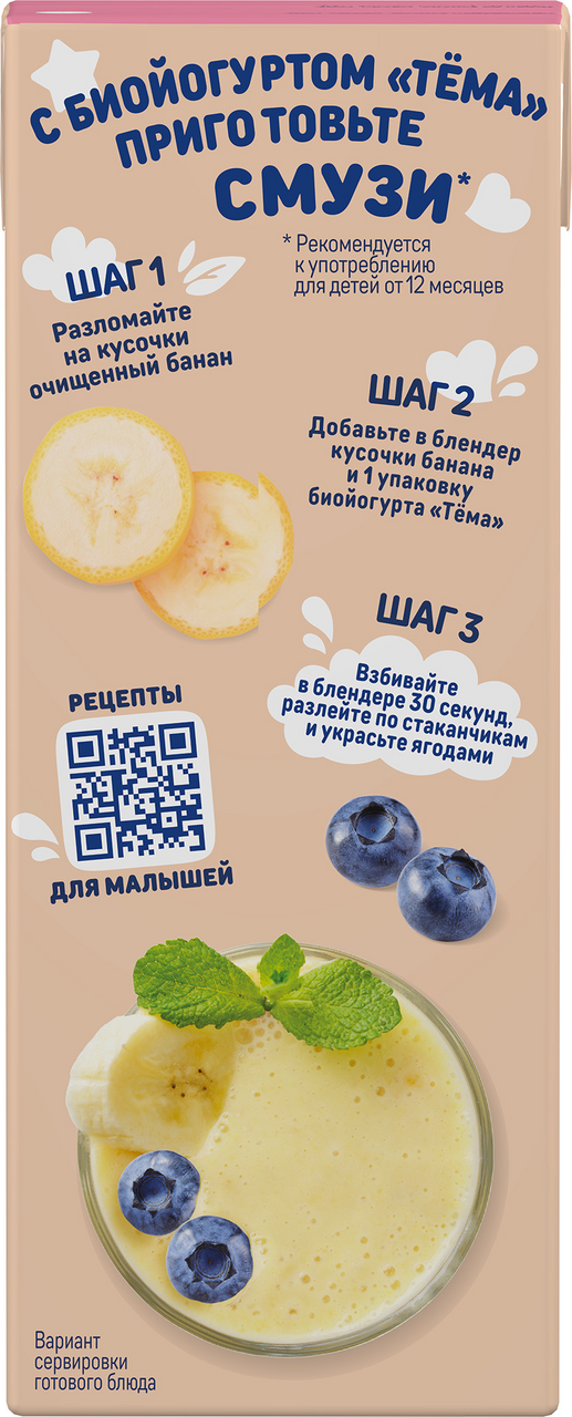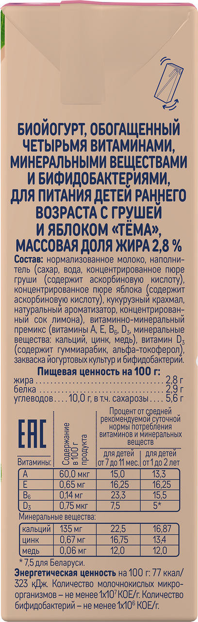 Питьевой биойогурт с грушей и яблоком Тёма изготовлен из отборного молока и спелых фруктов от проверенных поставщиков.* Содержит бифидобактерии, витамины и минералы.* Проходит строгий контроль качества на всех этапах производства - суммарно около 100 тестов.