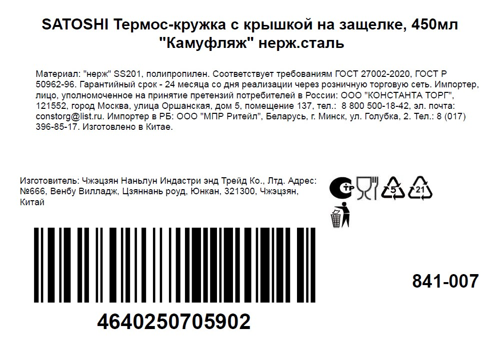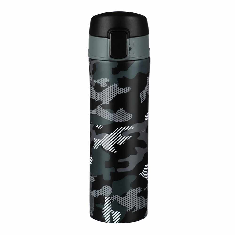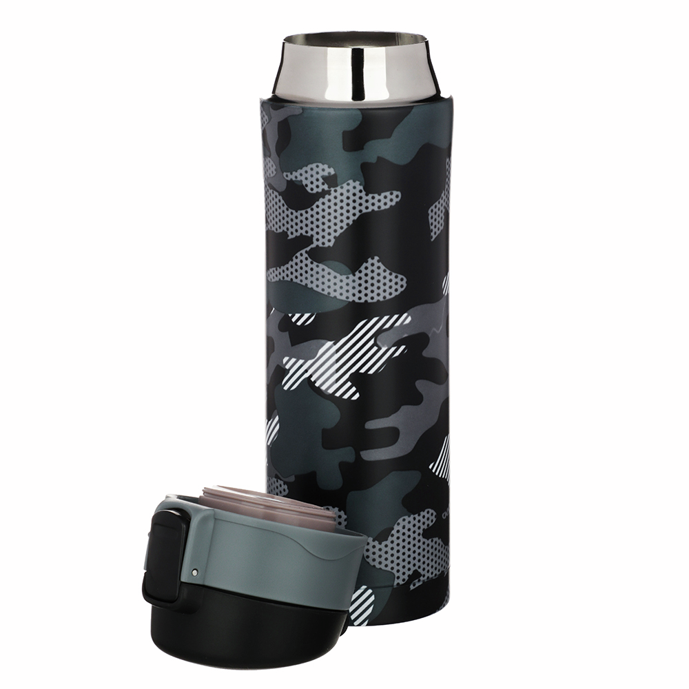 Кружка-термос Камуфляж с двойными стенками корпуса сохраняет напитки теплыми дольше обычного. Изделие выполнено из нержавеющей стали, обладающей гигиеничностью, отличными теплоизоляционными свойствами и повышенной устойчивостью к механическим повреждениям. Надежная крышка с защелкой исключает случайное открытие термоса в процессе транспортировки. Эргономичная система открывания крышки-поилки дает возможность использования термокружки одной рукой. Такой аксессуар удобно использовать на отдыхе, работе и в автомобиле.