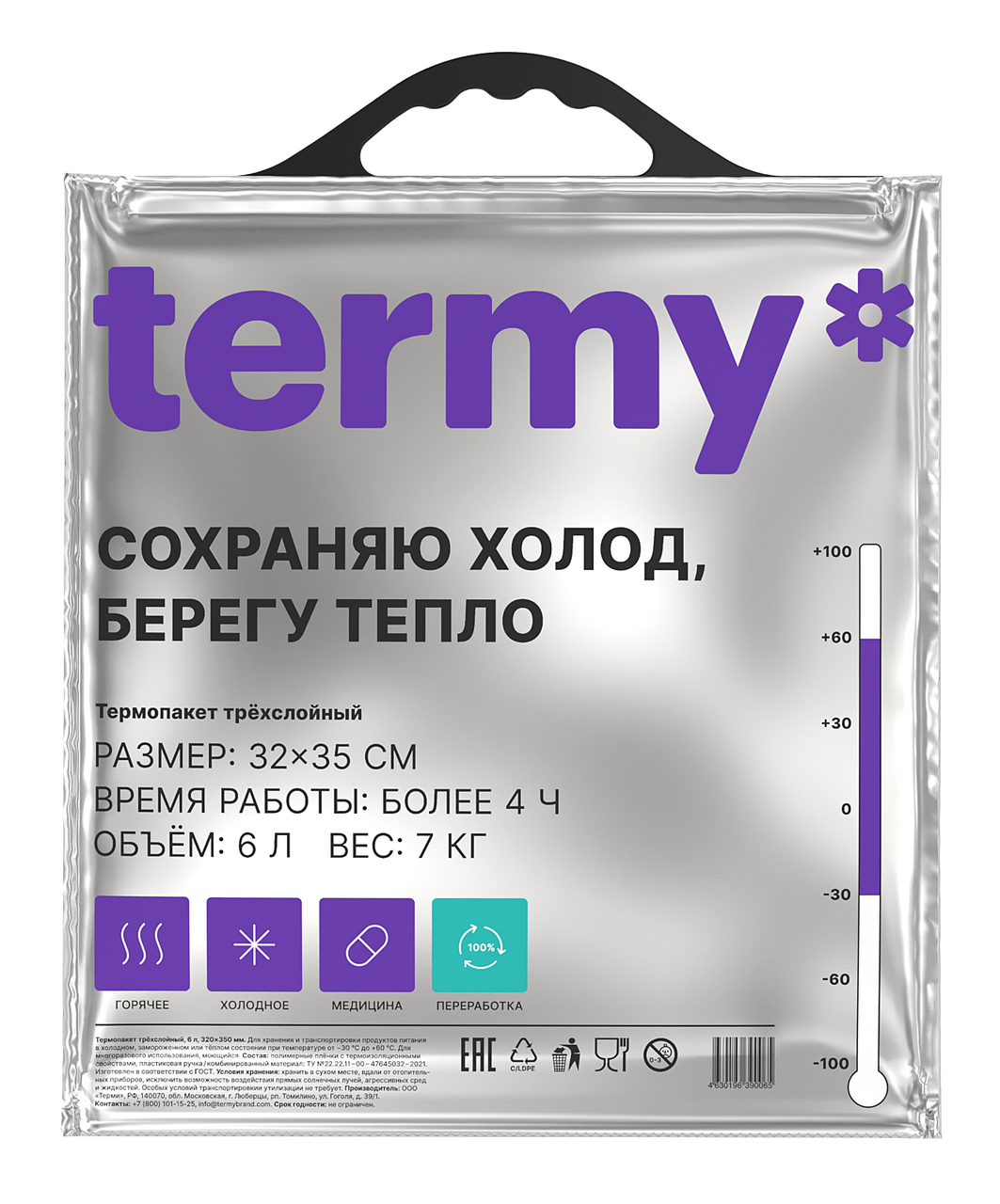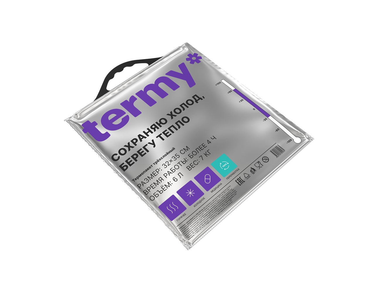 Трехслойный, многоразовый и прочный термопакет Терми предназначен для поддержания температуры охлаждённых или горячих продуктов питания. Сохраняет температуру более 4 часов, он вместительный и легко моется. Пакет-холодильник для продуктов - лёгкий и портативный способ защитить еду в дороге, идеально подходит для кемпинга, пикника, рыбалки и отдыха на природе. Термопакет не занимает много места, поэтому его легко положить в рюкзак или сумку, а анатомическая ручка-защелка не режет руки при транспортировке, надежно закрывает термопакет, удобно расстегивается. Многоразовый термо пакет изотермический это новый способ путешествий в комфорте с помощью хладогентов.