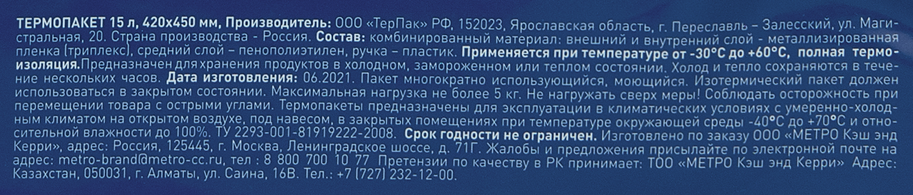 METRO Chef Термопакет, 450 мм x 420 мм– незаменимый предмет в быту. Он отлично хранит заданную температуру в течение нескольких часов – как тепло, так и холод. При этом стоит помнить, что пакет, в котором находятся продукты, должен быть плотно закрытым, чтобы он сохранял текущую температуру как можно дольше. В случае загрязнений изотермический пакет легко можно помыть и использовать дальше, поскольку он рассчитан на многоразовое использование. Это идеальный вариант для поездок за город, на пикник и просто на дачу. За счет достаточной больших размеров в пакет без труда помещаются большие куски замороженного мяса и овощей, тушка птицы и несколько килограммов замороженных пельменей, вареников и пр. Пакет легко складывается и не деформируется, поэтому его удобно хранить в любом месте.