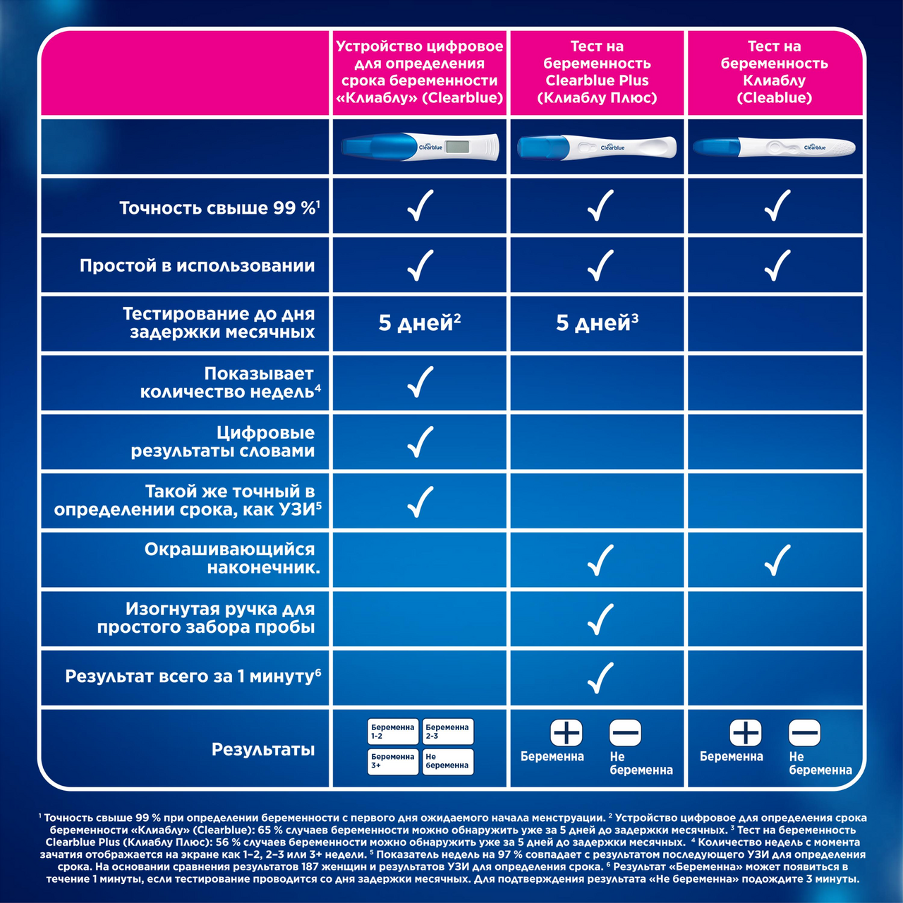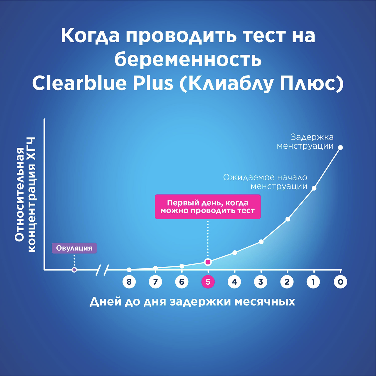 Раннее тестирование: результаты за 5 дней до дня задержки месячных (4 дня до ожидаемого начала менструации); - Никакой другой бренд не является более точным: у Clearblue точность свыше 99% со дня ожидаемого начала менструации; - Простой для считывания результат плюс (+) или минус (–); - Результат всего за 1 минуту; - Отмеченный наградой простой в использовании дизайн (RedDot Design Award 2012); - Более 35 лет исследований. Наши научно-исследовательские лаборатории в Великобритании разрабатывают продукцию с 1985г. Используйте тест на беременность Clearblue Plus (Клиаблу Плюс) для точного прочтения на ранних сроках. С помощью этого комплекта домашних тестов на беременность можно проводить тест за 5 дней до задержки месячных, то есть за 4 дня до ожидаемого начала менструации. Чтобы избежать томительного ожидания результатов, воспользуйтесь тестом на беременность Clearblue Plus (Клиаблу Плюс), который может показать результат Беременна всего за 1 минуту, если тестирование проводится со дня задержки месячных. Для подтверждения результата Не беременна следует подождать 3 минуты. Этот домашний тест на беременность разработан для максимальной простоты использования благодаря очень широкому окрашивающемуся наконечнику и эргономичной изогнутой ручке. У этого домашнего теста на беременность точность свыше 99% со дня ожидаемого начала менструации, как вы и ожидаете от Clearblue. Уникальная технология Floodguard позволяет более чем на 70% снизить вероятность возникновения самой распространенной ошибки пользователей (по сравнению с дизайном нашего предыдущего визуального теста), предотвращая попадание избыточного количества мочи на тест-полоску за счет очень широкого наконечника и обеспечивая правильный результат. 56% случаев беременности можно обнаружить уже за 5 дней до задержки месячных. Данное устройство предназначено для домашнего использования. Храните в местах, недоступных для детей. Перед использованием внимательно прочтите прилагаемые инструкции.