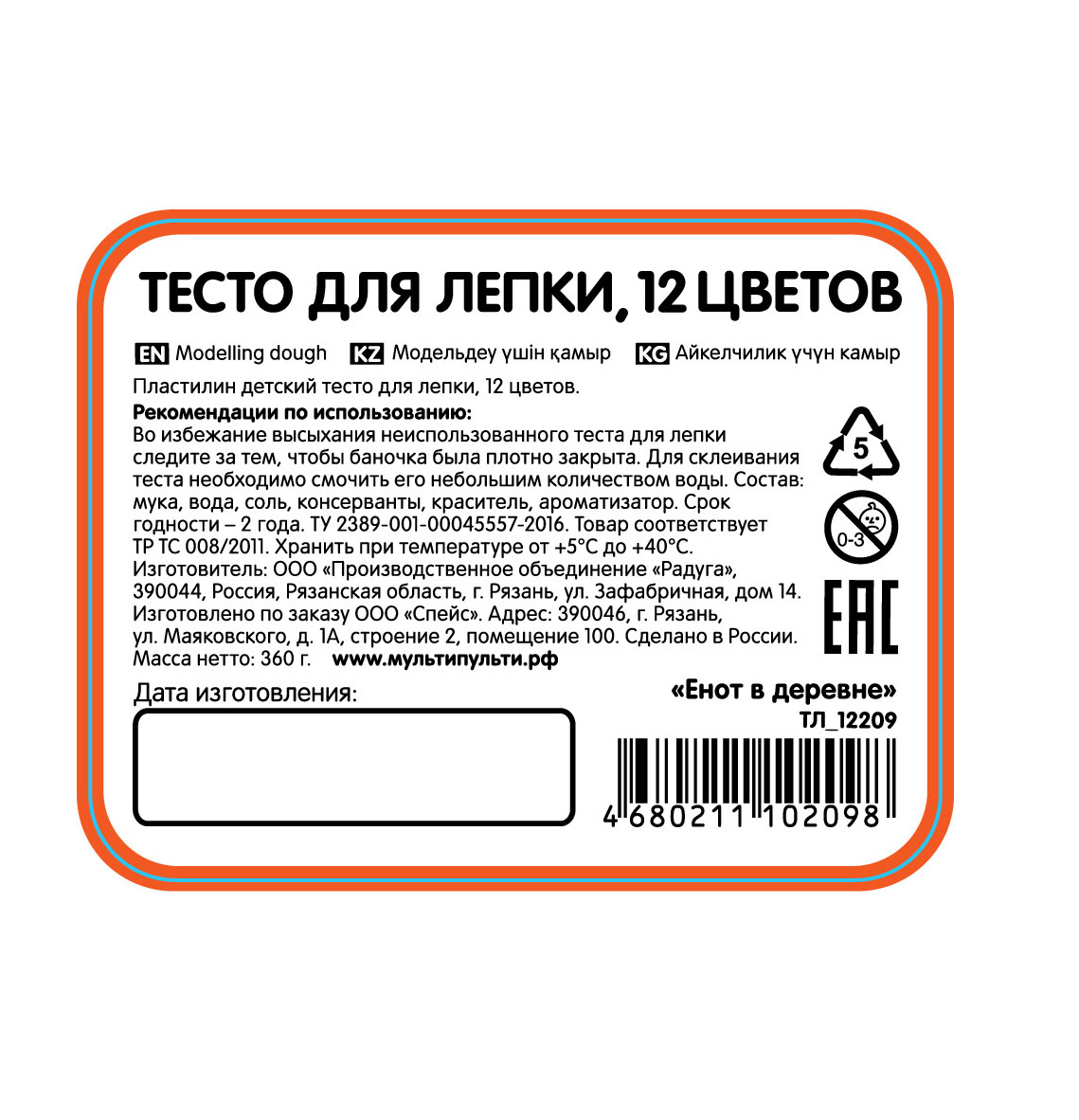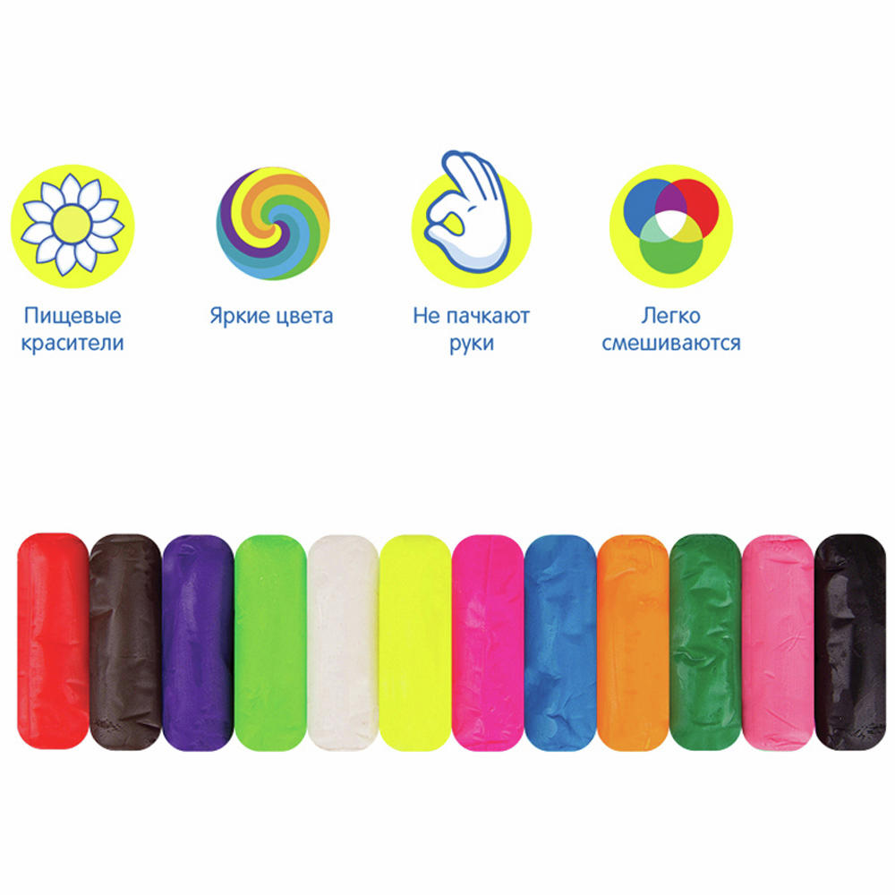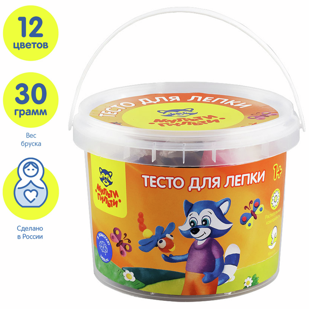 Набор теста для лепки Мульти-Пульти серия Енот в деревне из двенадцати ярких цветов: красный, голубой, желтый, зеленый, синий, коричневый, белый, розовый, оранжевый, салатовый, фуксия, черный.