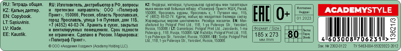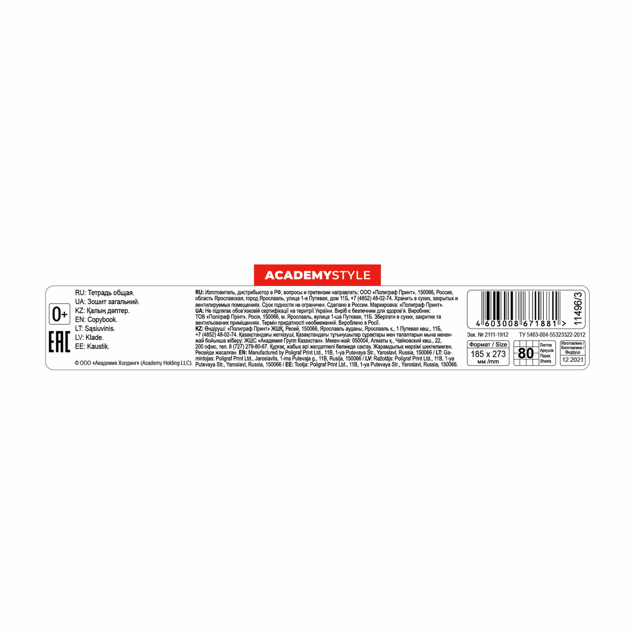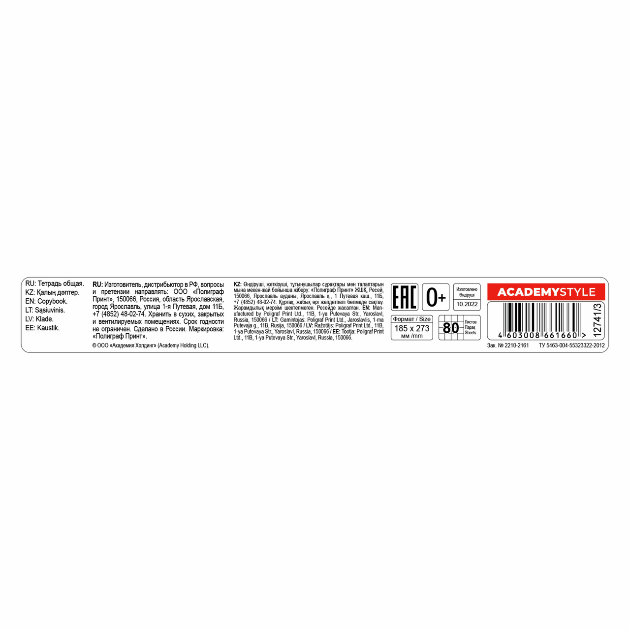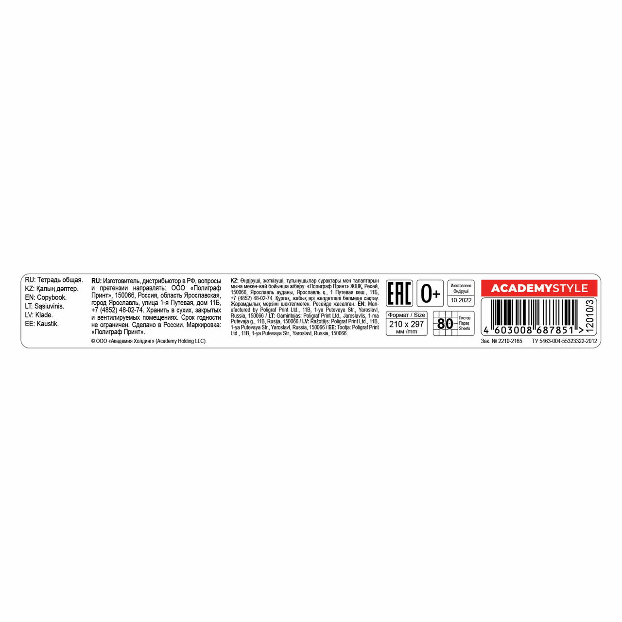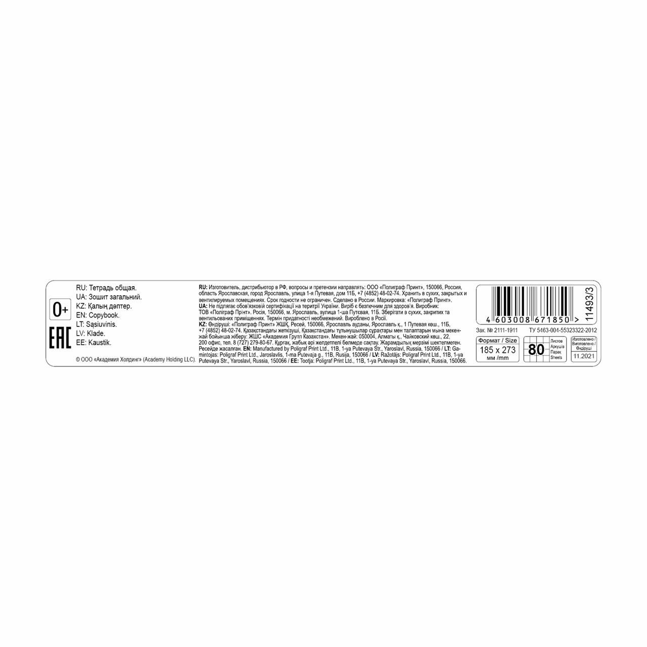 Тетрадь общая. Формат: А4 (185х273 мм). Количество листов: 80. Внутренний блок: белый офсет. Тип линовки блока: клетка, без полей. Тип крепления блока: скобы.