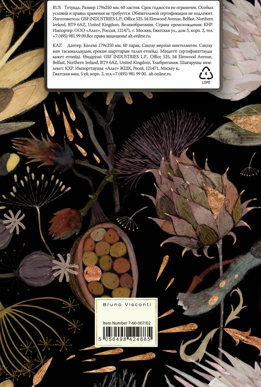 Тетрадь общая BrunoVisconti B5 (179x250 мм) в клетку для ведения записей различного характера. Благодаря гребню и плотной обложке страницы тетради можно переворачивать на 360 градусов и делать записи на весу во время брифингов, презентаций. А можно раскрывать тетрадь на 180 градусов, держа открытой на столе. Дизайн обложки – авторский. Обложка изготовлена из картона плотностью 350 г/кв.м с матовой ламинацией Soft Touch и тиснением под золото. Внутренний блок содержит 60 листов белой бумаги плотностью 70 г/кв.м.