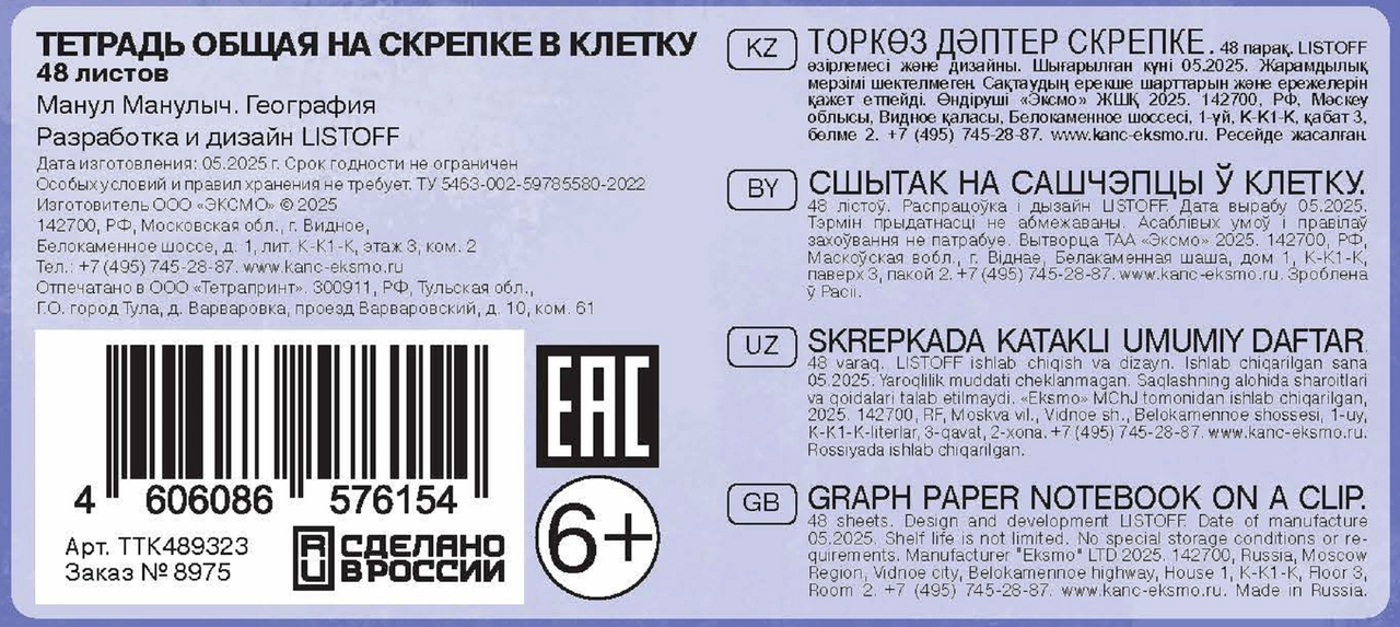 Компания Эксмо представляет харизматичного Манула Манулыча на обложках предметных тетрадей. Оригинальный дизайн с любимым героем поднимет настроение и сделает учебу интереснее. Тетради формата А5 скреплены прочной скрепкой, внутри - 48 листов качественной офсетной бумаги плотностью 60г/м. Обложка из мелованного картона с ламинацией soft-touch приятна на ощупь и устойчива к износу. Выбирайте любимый предмет и отправляйтесь навстречу знаниям вместе с Манулом Манулычем.
