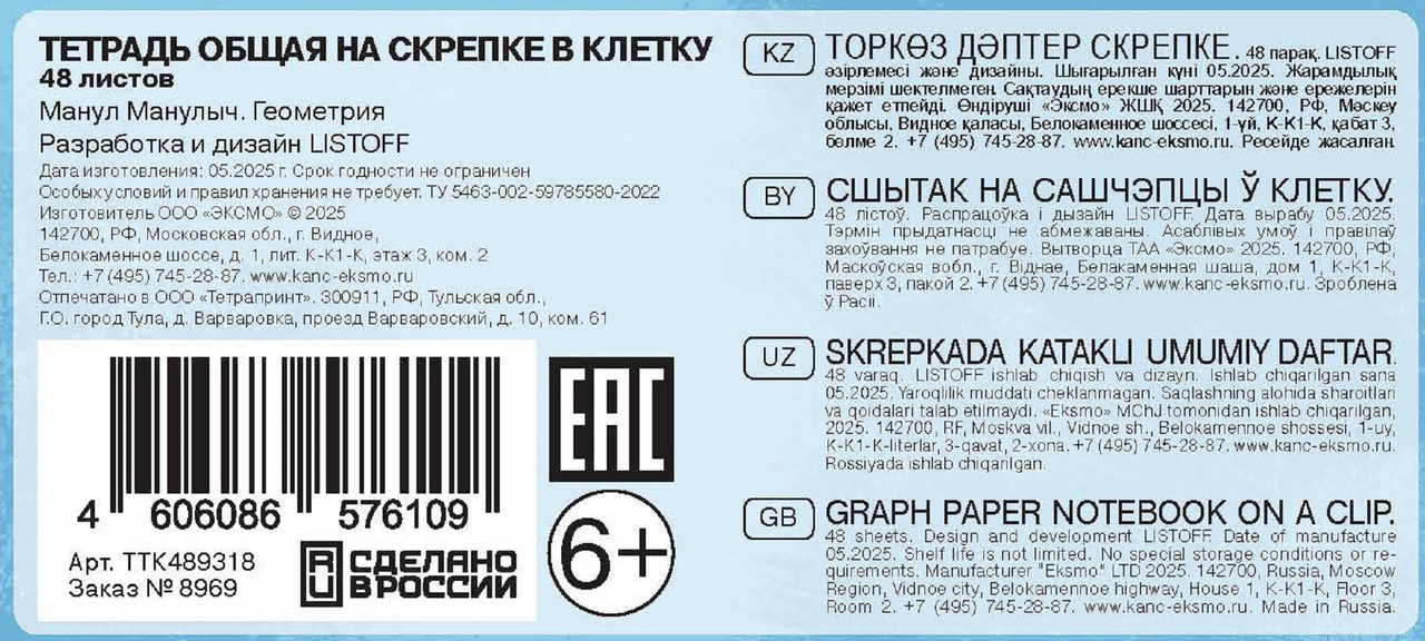 Компания Эксмо представляет харизматичного Манула Манулыча на обложках предметных тетрадей. Оригинальный дизайн с любимым героем поднимет настроение и сделает учебу интереснее. Тетради формата А5 скреплены прочной скрепкой, внутри - 48 листов качественной офсетной бумаги плотностью 60г/м. Обложка из мелованного картона с ламинацией soft-touch приятна на ощупь и устойчива к износу. Выбирайте любимый предмет и отправляйтесь навстречу знаниям вместе с Манулом Манулычем.
