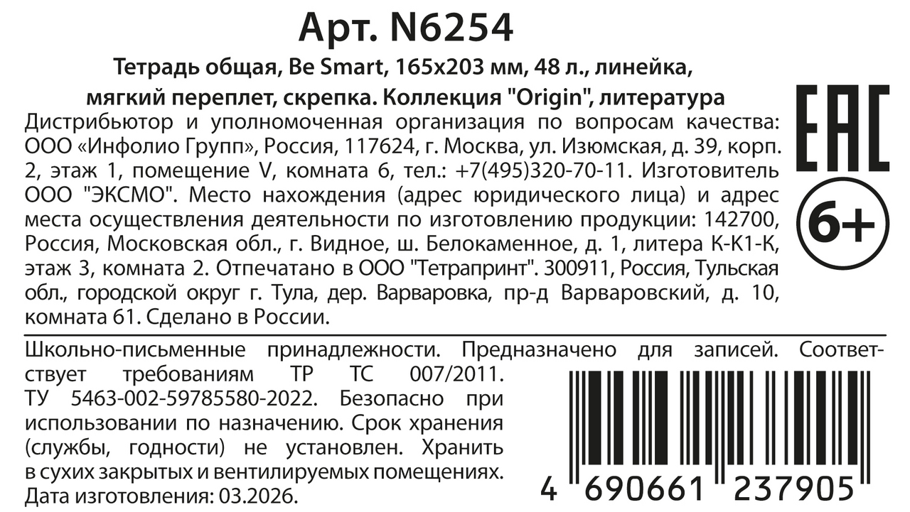 Тетрадь предметная Be Smart Origin Литература А5, 48л