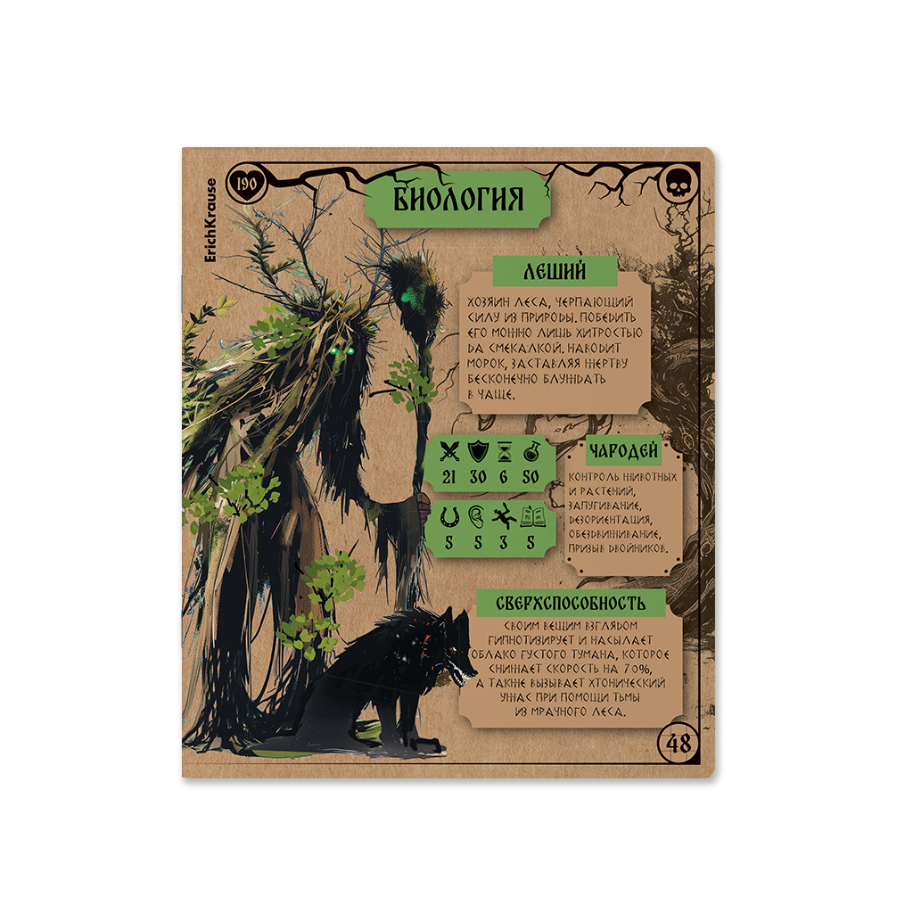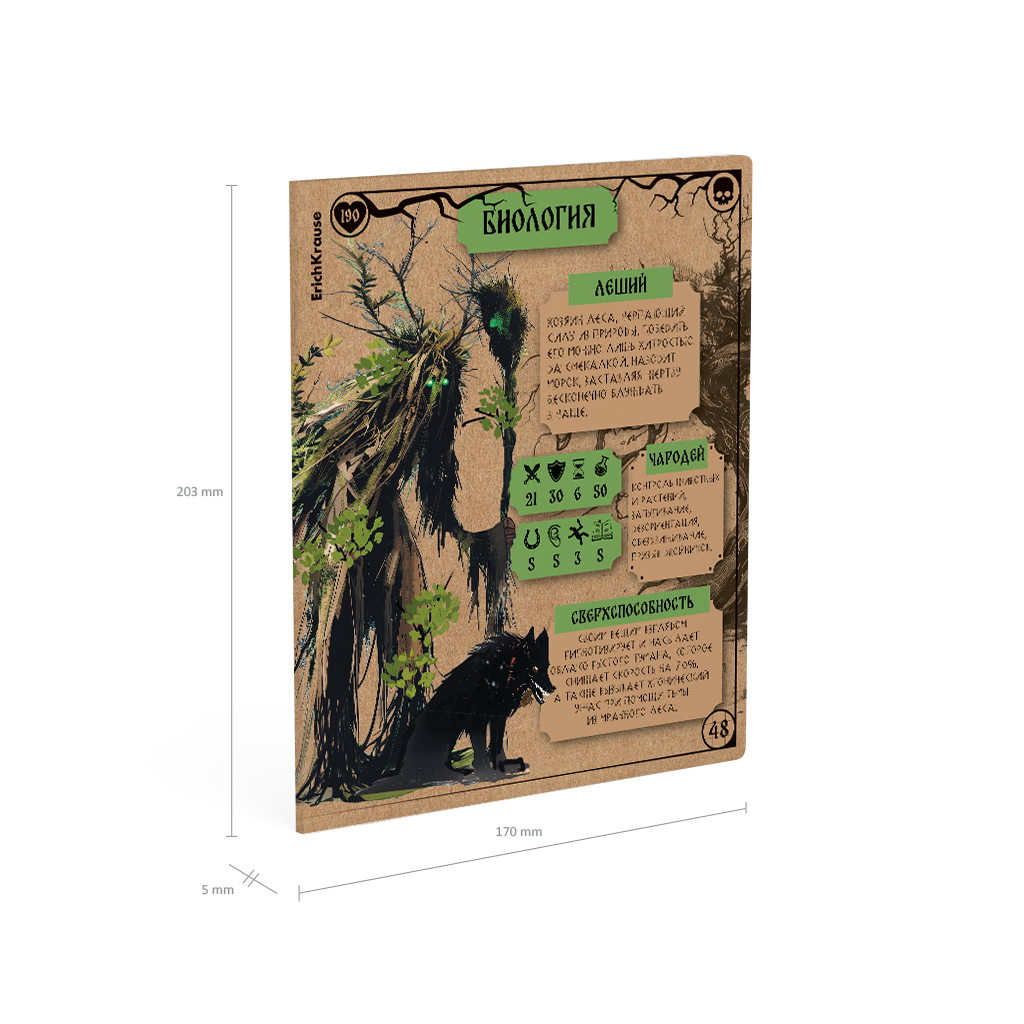 Тетрадь предметная формата А5+ (170х203мм). Имеет инфо-блок с кратким изложением школьной программы. Обложка из высококачественного крафтового картона плотностью 190г/м2. В блоке 48 листов в клетку с полями. Бумага офсетная плотностью 60г/м2. Цвет линовки - синий. Скругленные уголки обложки и блока. Тип скрепления - скоба. Тетради разного дизайна упакованы в термоусадочную пленку по 5 штук. Это захватывающая страница сборника сказочных персонажей от Кощея до Соловья-разбойника с характеристиками и классификациями. Концепция отражает богатство русского фольклора и мифологии, объединённое с атрибутикой настольных игр. Обложка тетрадей изготовлена из крафтового картона, что несёт в себе практическую и эстетическую функции. С одной стороны, плотный материал защищает от внешних воздействий, с другой - передаёт ощущение старорусского стиля. На задней обложке расположен краткий справочник по школьной программе - нужная информация у школьника под рукой.