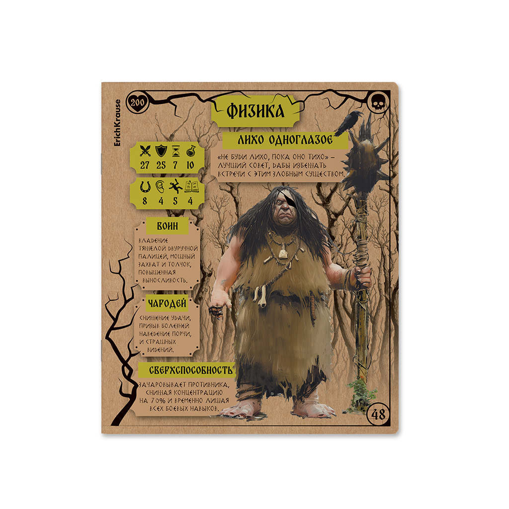 Тетрадь предметная формата А5+ (170х203мм). Имеет инфо-блок с кратким изложением школьной программы. Обложка из высококачественного крафтового картона плотностью 190г/м2. В блоке 48 листов в клетку с полями. Бумага офсетная плотностью 60г/м2. Цвет линовки - синий. Скругленные уголки обложки и блока. Тип скрепления - скоба. Тетради разного дизайна упакованы в термоусадочную пленку по 5 штук. Это захватывающая страница сборника сказочных персонажей от Кощея до Соловья-разбойника с характеристиками и классификациями. Концепция отражает богатство русского фольклора и мифологии, объединённое с атрибутикой настольных игр. Обложка тетрадей изготовлена из крафтового картона, что несёт в себе практическую и эстетическую функции. С одной стороны, плотный материал защищает от внешних воздействий, с другой - передаёт ощущение старорусского стиля. На задней обложке расположен краткий справочник по школьной программе - нужная информация у школьника под рукой.