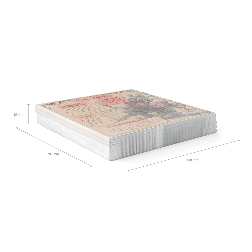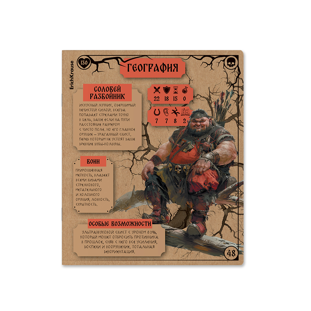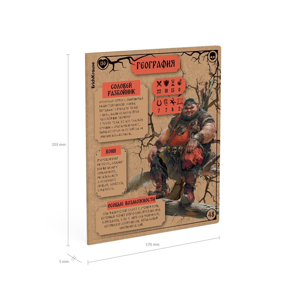 Тетрадь предметная формата А5+ (170х203мм). Имеет инфо-блок с кратким изложением школьной программы. Обложка из высококачественного крафтового картона плотностью 190г/м2. В блоке 48 листов в клетку с полями. Бумага офсетная плотностью 60 г/м2. Цвет линовки - синий. Скругленные уголки обложки и блока. Тип скрепления - скоба. Тетради разного дизайна упакованы в термоусадочную пленку по 5 штук. Это захватывающая страница сборника сказочных персонажей от Кощея до Соловья-разбойника с характеристиками и классификациями. Концепция отражает богатство русского фольклора и мифологии, объединённое с атрибутикой настольных игр. Обложка тетрадей изготовлена из крафтового картона, что несёт в себе практическую и эстетическую функции. С одной стороны, плотный материал защищает от внешних воздействий, с другой - передаёт ощущение старорусского стиля. На задней обложке расположен краткий справочник по школьной программе - нужная информация у школьника под рукой.