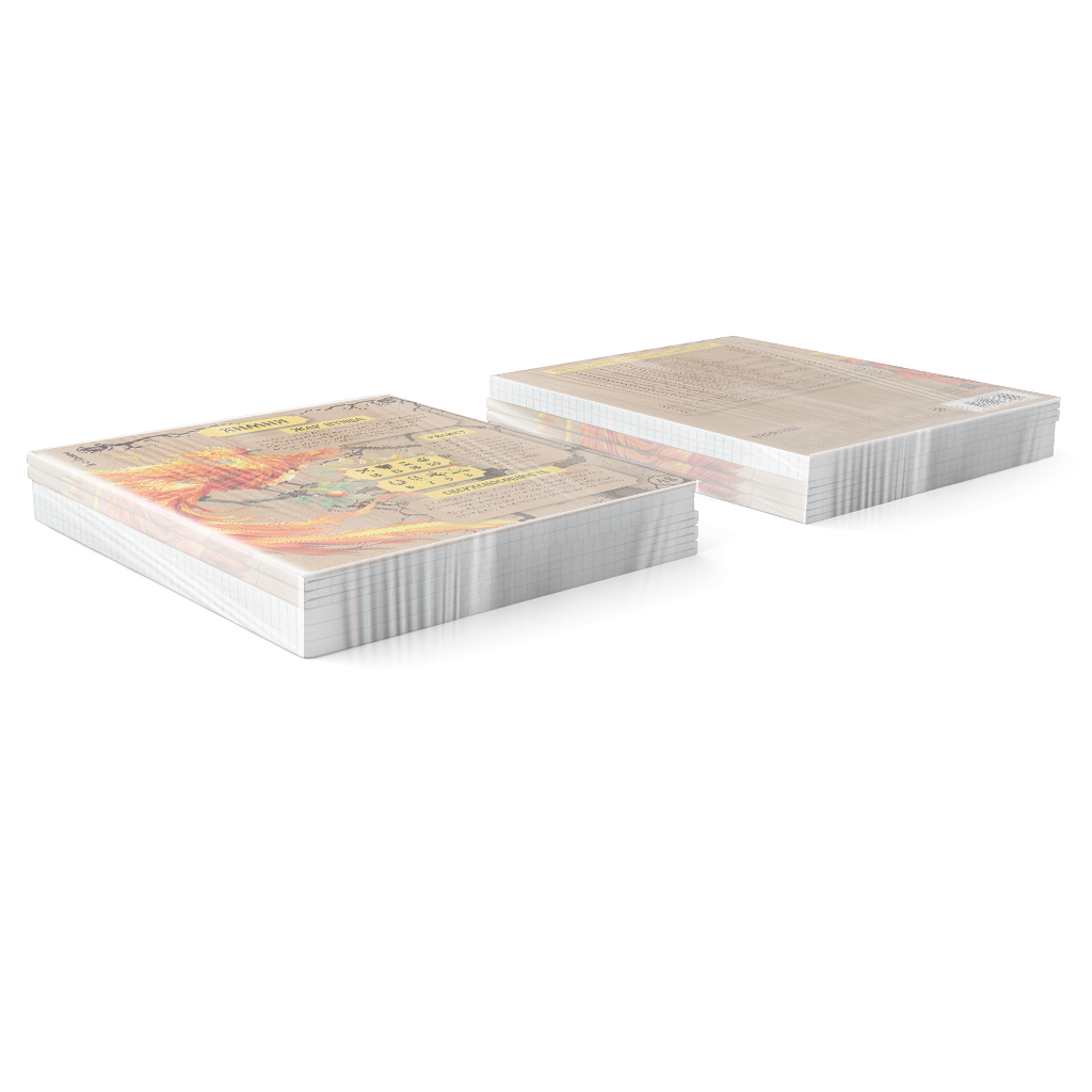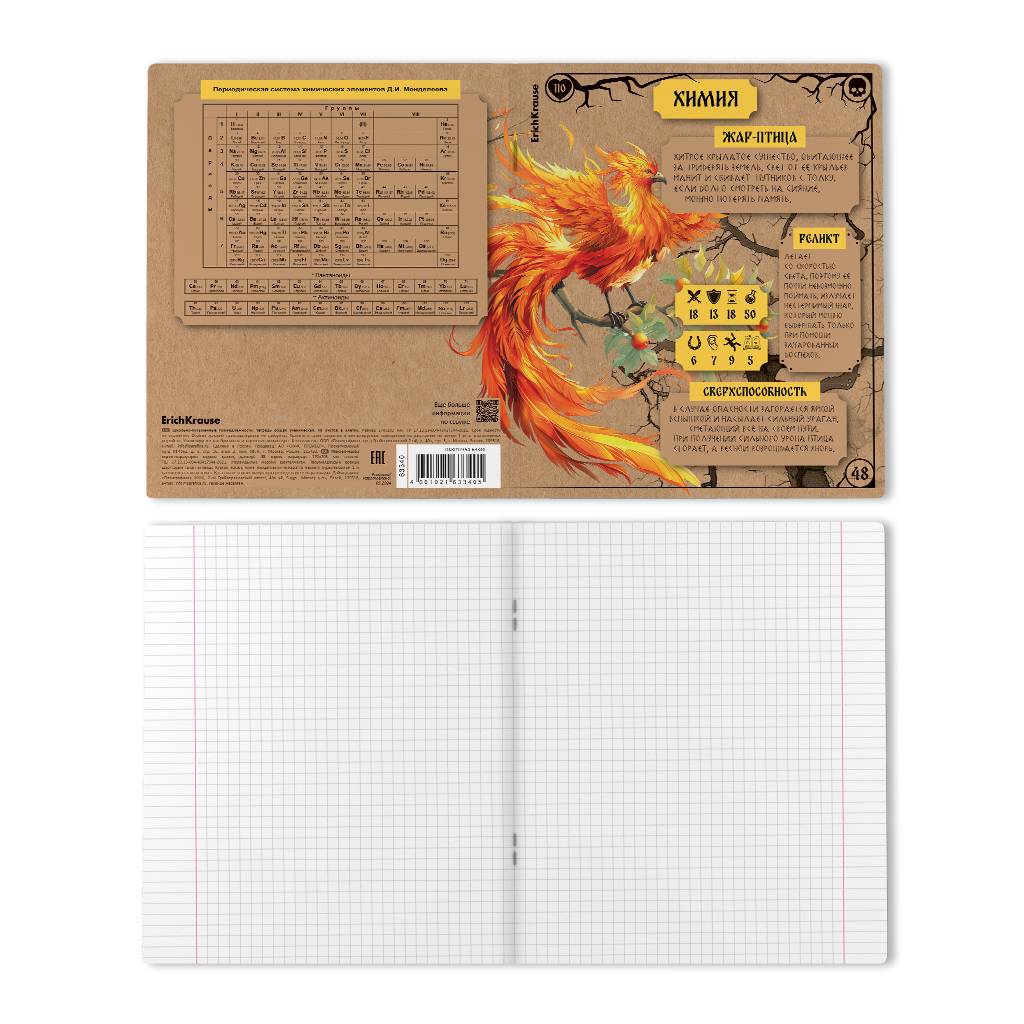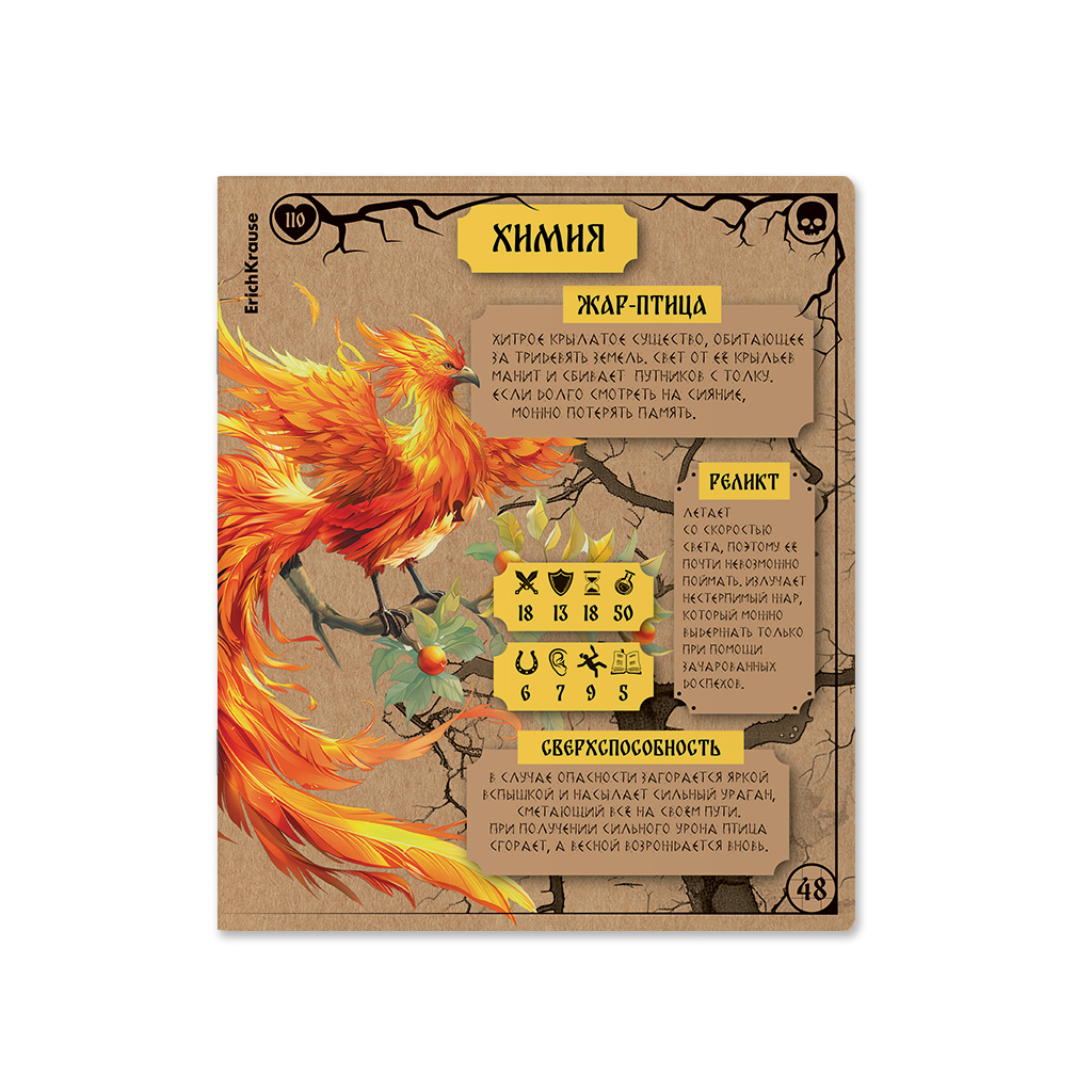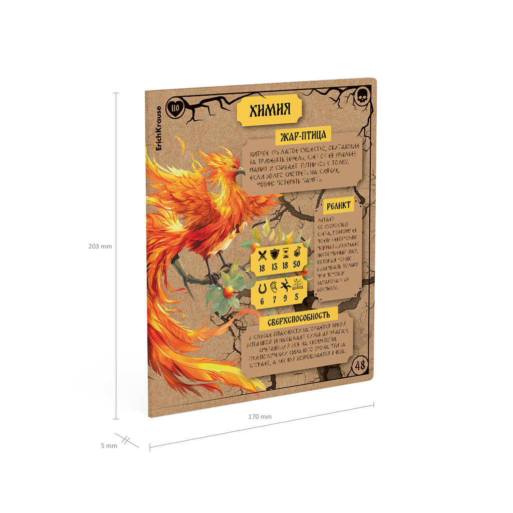 Тетрадь предметная формата А5+ (170х203мм). Имеет инфо-блок с кратким изложением школьной программы. Обложка из высококачественного крафтового картона плотностью 190г/м2. В блоке 48 листов в клетку с полями. Бумага офсетная плотностью 60г/м2. Цвет линовки - синий. Скругленные уголки обложки и блока. Тип скрепления - скоба. Тетради разного дизайна упакованы в термоусадочную пленку по 5 штук. Это захватывающая страница сборника сказочных персонажей от Кощея до Соловья-разбойника с характеристиками и классификациями. Концепция отражает богатство русского фольклора и мифологии, объединённое с атрибутикой настольных игр. Обложка тетрадей изготовлена из крафтового картона, что несёт в себе практическую и эстетическую функции. С одной стороны, плотный материал защищает от внешних воздействий, с другой - передаёт ощущение старорусского стиля. На задней обложке расположен краткий справочник по школьной программе - нужная информация у школьника под рукой.