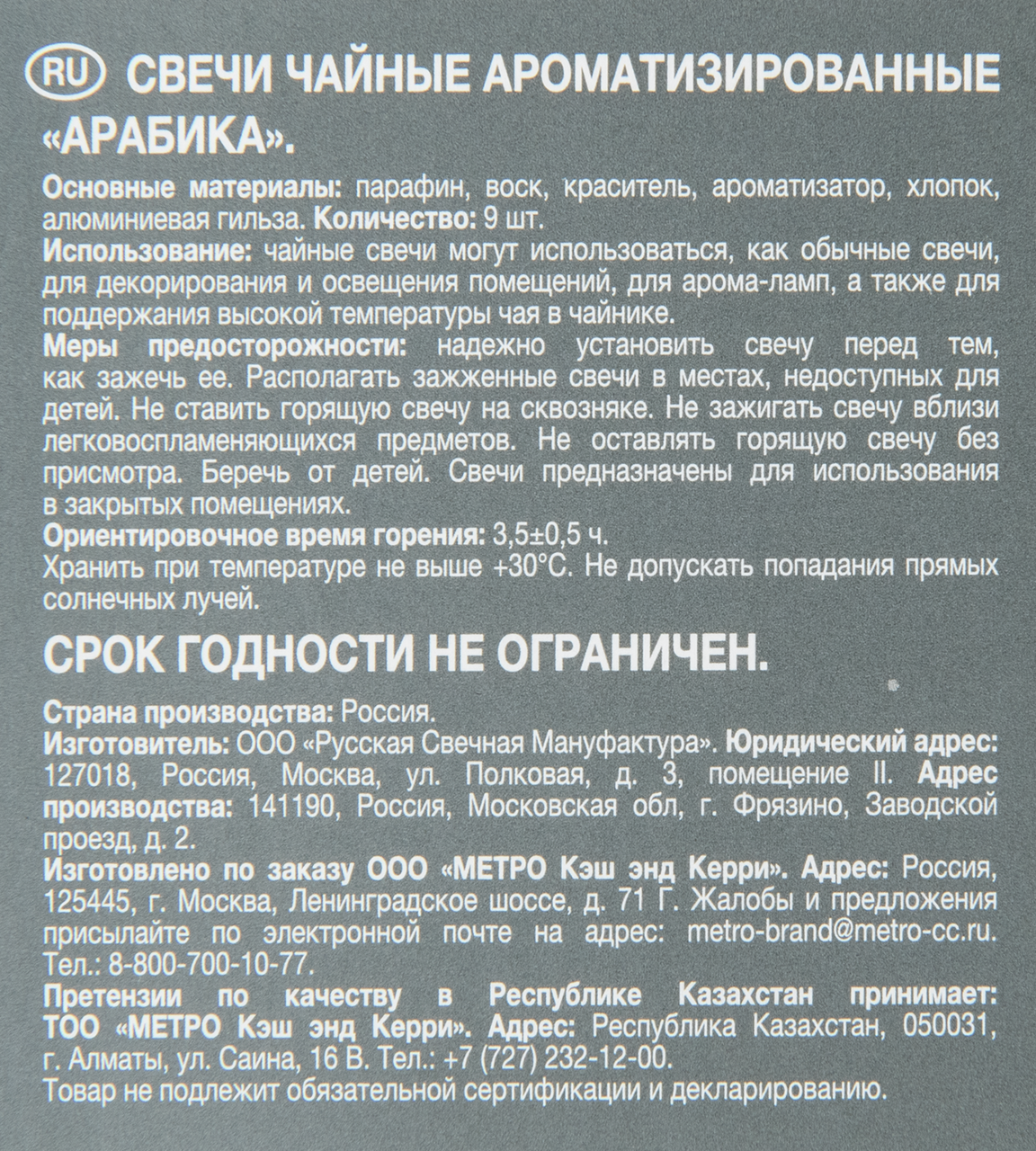 Tarrington House Свеча Чайная ароматическая Арабика, 9шт предназначена для освещения и украшения помещений. Комплект аксессуаров для интерьера создает уютную романтическую атмосферу, декорирует праздничный стол, интерьер квартиры или загородного дома. Модель подходит, в том числе, для принятия ванны, йоги и медитации, погружения в полный релакс. Свеча испускает аромат кофе, который наполняет помещение нежностью и теплом. Он вызывает ощущение безопасности, комфорта, убирает излишнюю тревожность, чувство беспокойства и подавленности. Стильный элемент интерьера гармонично вписывается в различные стили: от классики, модерна до скандинавского или рустикального. Они также хорошо создают акценты и добавляют теплоту к минималистическому интерьеру. Элегантный дизайн и привлекательное исполнение создают изменчивую игру света и тени. Свечи горят аккуратно, не текут и не потрескивают, а время их горения составляет около 3-4 часов. Аксессуары можно расположить в гостиных и спальнях, мансарде или ванной комнате. Благодаря компактному размеру они легко помещаются на мебели, в серванте или на журнальном столике. Дополнительно их можно поставить в оригинальный стеклянный подсвечник, аромалампу, фигурный чайник или фондю, в зависимости от назначения, настроения и общего антуража в помещении. Свечи не рекомендуется ставить рядом с легковоспламеняющимися предметами. Хранить изделие необходимо вдали от прямых солнечных лучей и детей.