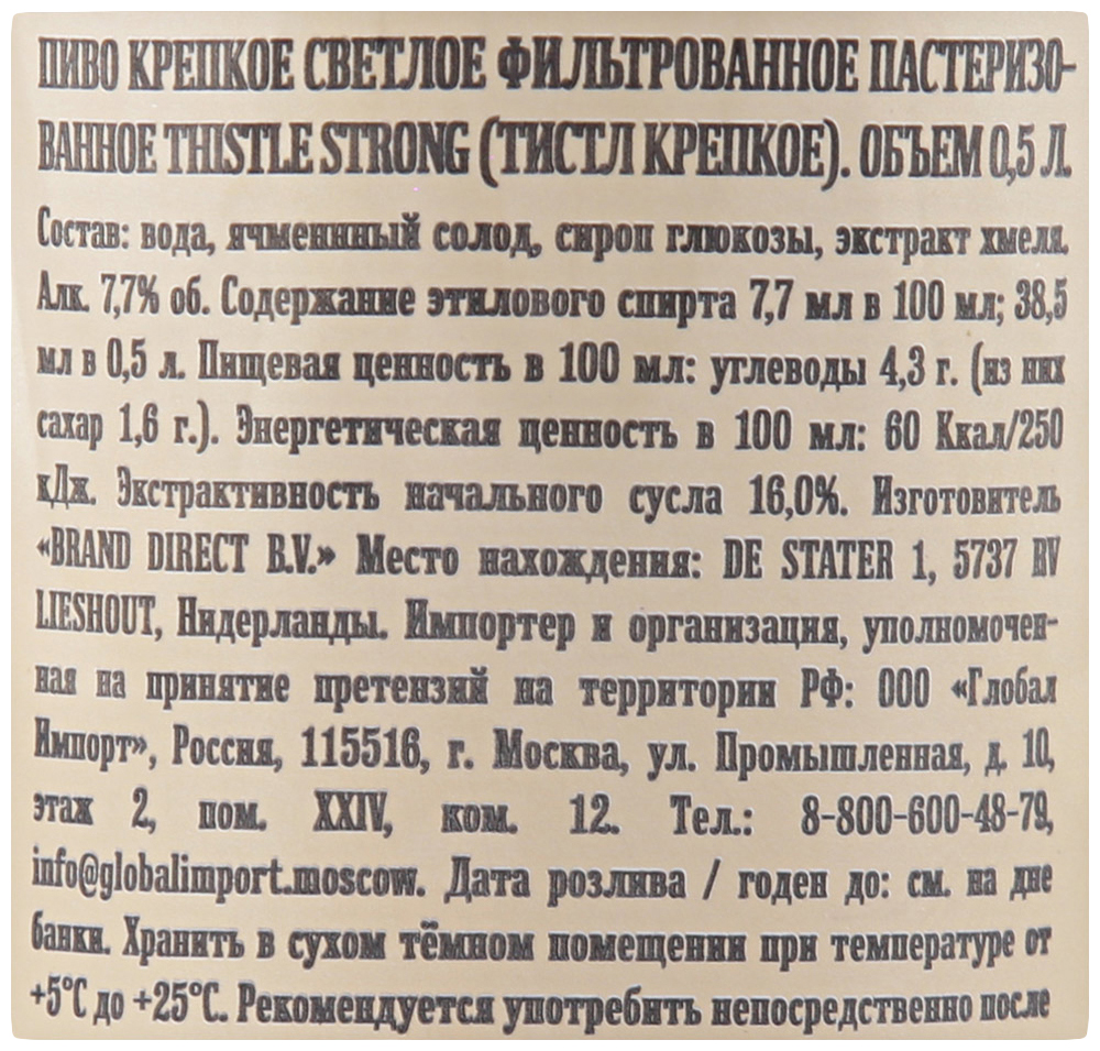 Пиво THISTLE Стронг в жестяной банке, 0,5 л отличается особенно полным, насыщенным вкусом, оставляющим практически неуловимую горчинку послевкусия. Изготовлено из нескольких сортов лучшего хмеля и отборного солода. Пользуется большим спросом у потребителей разного возраста (старше 18 лет). Прекрасно подойдет для вечеринки с друзьями или просмотра футбольного матча перед телевизором. Сочетается с любыми рыбными блюдами, морепродуктами, мясом и снеками. Защищать от прямых солнечных лучей и низких температур. Противопоказания: дети до 18 лет, беременность и кормление грудью, заболевания центральной нервной системы, почек, печени и других органов пищеварения. Рекомендуется употреблять содержимое непосредственно после вскрытия упаковки. Чрезмерное употребление алкоголя вредит здоровью. Приобрести пиво THISTLE Стронг в жестяной банке, 0,5 л можно в торговом центре METRO. Меры предосторожности: алкоголь противопоказан детям и подросткам до 18 лет, беременным и кормящим женщинам, лицам с заболеваниями центральной нервной системы, почек, печени и других органов пищеварения. Чрезмерное употребление алкоголя вредит здоровью.