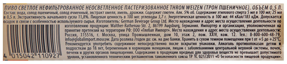 Пиво THRON WEIZEN пшеничное, в железной банке, 0,5 л – продукт немецкой пивоварни Darguner Brauerei. Производство расположено в городке Даргун, который относится к одним из экологически чистых уголков Западной Европы. Светлый, фильтрованный пастеризованный напиток сварен в классическом стиле производителей Северной Германии. Для его производства использованы чистая вода, хмель, ячменный солод.Алкогольный напиток обладает пшеничным оттенком, пышной пеной средней плотности и легким медово-солодовым ароматом. В мягком вкусе присутствуют цветочно-травяные оттенки хмеля, а в послевкусии доминирует пикантная горчинка. Пиво хорошо освежает, утоляет жажду и расслабляет после напряженного дня.Перед употреблением пиво рекомендуется охладить до 2-7 градусов. Его можно пить без закуски или сочетать с несладкими снеками, баварскими крендельками, чесночными гренками. Дополнением к напитку также станут морепродукты, овощные салаты, рыба, пицца. На его основе можно приготовить оригинальные коктейли – Пивная Маргарита, Пиво с витамином С, Микелада, Красный глаз и другие. Приобрести пиво THRON WEIZEN пшеничное, в железной банке, 0,5 л можно в торговом центре METRO.Меры предосторожности: алкоголь противопоказан детям и подросткам до 18 лет, беременным и кормящим женщинам, лицам с заболеваниями центральной нервной системы, почек, печени и других органов пищеварения. Чрезмерное употребление алкоголя вредит здоровью.