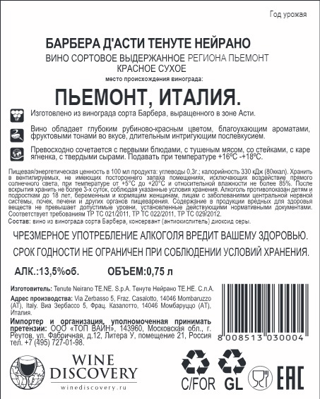 Вино Tenute Neirano Tirteo Barbera d'Asti Superiore красное сухое, 0.75л производится по классической рецептуре в лучших традициях итальянского виноделия. Этот напиток родом с Пьемонта, региона, знаменитого своими винодельнями. Там, под ярким солнцем зреет и набирает силу сорт бербера, который используется для производства этого моносортного вина. Собирают плоды в момент оптимальной спелости. Их тщательно сортируют и отправляют на д��льнейшую переработку в винодельни, где ягоды мягко прессуют. Винификация проводится при определенных условиях (соблюдение температурного режима контролируется профессиональными сотрудниками компании). В дальнейшем винный материал помещается в маленькие дубовые бочки, где выдерживается в течение 12 месяцев. Второй этап выдержки начинается после разлива напитка по стеклянным бутылкам и занимает полгода. Только после этого он направляется на продажу. Цвет у этого вина интенсивный, насыщенный, рубиново-красный, темный. При откупоривании бутылки ощущается палитра с нотками смородины, черники и вишни, смешанными со сладкими специями. Во время дегустации чувствуется отлично сбалансированный вкус, в котором присутствуют шелковистые танины, красные ягоды и спелая вишня. Послевкусие длительное и приятное. Подавать такой напиток лучше всего с мясом красных сортов (стеками, жареной свининой, каре ягненка или пикантными колбасками). Отличная комбинация получается с сырными тарелками. Рекомендуемая температура подачи +16-18С.